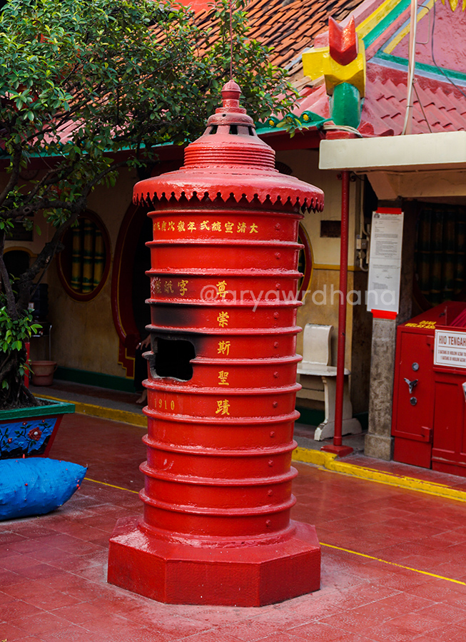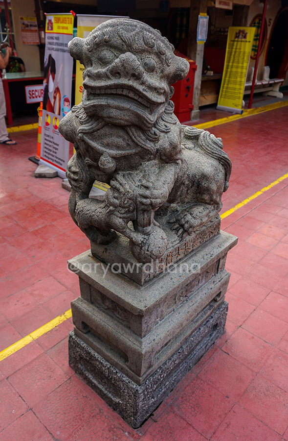 Di depan kelenteng ini terdapat sepasang patung singa, yang biasa disebut ciok say. Patung ini disumbangkan pada tahun 1827 dan didatangkan langsung dari Tiongkok. Masing-masing patung melambangkan unsur yin dan yang. Unsur yin digambarkan dengan singa betina dengan mulut tertutup dan anak singa di bawah kakinya, sedangkan unsur yang digambarkan dengan patung singa jantan dengan mulut terbuka dan sebuah bola di kakinya. Selain itu terdapat lonceng perunggu dengan nama Wende Miao dalam bahasa mandarin, yang dibuat di Tiongkok pada tahun 1835. Selain patung dan lonceng, kelenteng ini juga menyimpan banyak artefak, misalnya hiasan pada hiolo atau tempat menancapkan hio bakar di altar utama kelenteng yang dibuat pada tahun 1805.