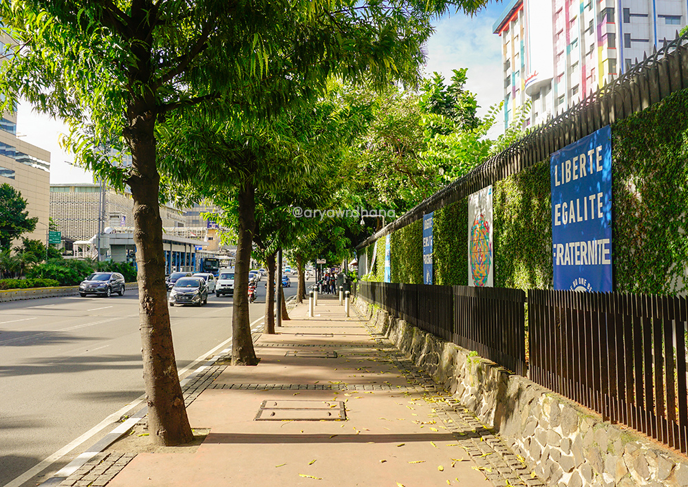 Kami kemudian melintasi gedung Kedutaan Besar Prancis atau Ambassade de France en Indonésie et au Timor oriental. Kalau dari tulisan berbahasa Prancis, kantor ini mewakili negara Prancis untuk Indonesia dan Timor Leste. Hubungan bilateral Indonesia dengan Prancis sendiri dimulai sejak 1951. Belum diketahui lokasi kedutaan ini antara 1951 hingga 1973, namun sejak 1973 hingga sekarang letaknya berada di Jalan M. H. Thamrin No. 30. Sebelum gedung yang baru, gedung yang lama memiliki 5 lantai dan dirancang oleh arsitek Soejoedi Wirjoatmodjo dari Gubah Laras (yang merancang gedung DPR/MPR, Manggala Wanabhakti dan ASEAN). Gedung selesai dibangun pada Agustus 1973 dengan biaya pembangunan Rp200 juta. Kedubes Prancis sempat pindah ke lantai 40 Menara BCA pada Maret 2012. Gedung lama dibongkar dan mulai dibangun kembali pada September 2013. Gedung baru berlantai 6 ini dirancang oleh arsitek Segond-Guyon dan resmi digunakan sejak November 2014. Gedung yang luasnya tiga kali lipat gedung lama ini meleburkan semua aktivitas institusi kebudayaan dan diplomasi Prancis ke dalam sebuah kompleks. Di Jalan M. H. Thamrin, pintu masuk mengarah ke kantor institusi kebudayaan Prancis (Institut Français d’Indonésie atau IFI) dan pintu di Jalan Sunda adalah kantor kedutaan.