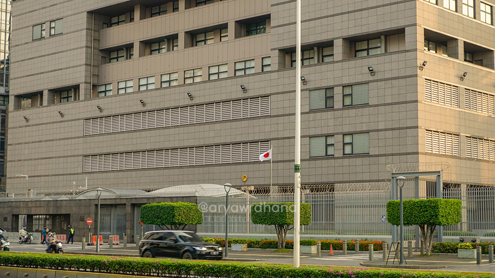 Tepat di seberangnya berdiri Kedutaan Besar Jepang. Bangunan unik ini termasuk beberapa dari gedung kedutaan yang menempati Jalan M. H. Thamrin. Hingga kemudian pada masa kepemimpinan Gubernur Fauzi Bowo dipusatkan di daerah Kuningan. Sayangnya tak banyak informasi yang disampaikan tentang gedung ini. Nah, tapi di sini juga menjadi bekas beberapa gedung kedutaan lainnya, seperti Kedutaan Besar Australia, Uni Soviet, dan Jerman Timur.