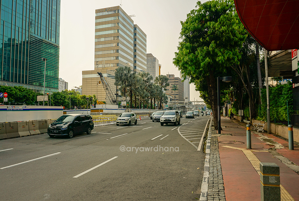 Huans mengatakan jika aspal jalan M.H. Thamrin berbeda dari aspal jalan lainnya di Jakarta. Lebih berdaya tahan lama terhadap tekanan kendaraan dan air hujan. Jalan M.H. Thamrin mempunyai dua jalur untuk kendaraan menuju dan dari arah Kebayoran. Di tengah-tengah ada sebuah tanah rumput yang lebarnya enam meter. Pada tahun 1961, jalan ini diperlebar guna mendukung Asian Games 1962. Untuk memecah kemacetan di simpangan antara Jalan M.H. Thamrin dengan Jalan Sudirman dibangunlah bundaran. Soekarno juga punya visi bahwa di sepanjang jalan M.H. Thamrin harus berdiri bangunan megah, maka dibangunlah tiga gedung pencakar langit yaitu Hotel Indonesia, Wisma Nusantara, dan Sarinah.