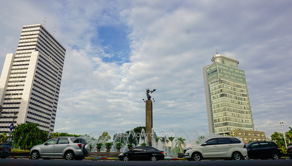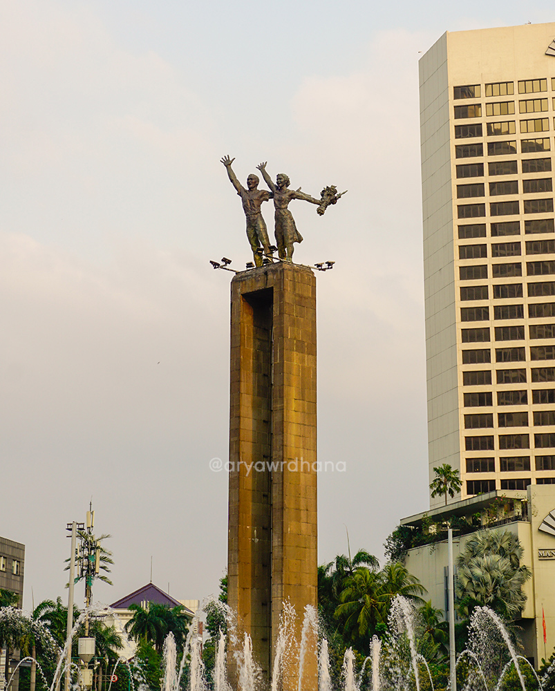 Di era Gubernur Sutiyoso pada tahun 2002, Bundaran Hotel Indonesia direstorasi dengan penambahan air mancur baru, desain kolam baru, dan pencahayaan. Air mancur di kolam ini berjumlah 5 formasi, yang masing-masing mengandung filosofi khusus, yaitu 5 ucapan selamat pagi, selamat siang, selamat sore, selamat malam, dan selamat berhari Minggu, atau bisa juga mengandung arti 5 wilayah di Jakarta, yakni Jakarta Pusat, Jakarta Selatan, Jakarta Utara, Jakarta Timur, dan Jakarta Barat, atau bisa dikaitkan pula dengan Pancasila.