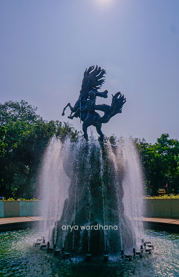 Karya pematung Moenir Pamoentjak ini memiliki tinggi 9 meter dan terdapat prasasti yang berisikan puisi karya penyair WS Rendra. Proses pembuatan patung dari rancangan hingga selesai membutuhkan waktu hampir satu tahun. Taman tempat patung ini berdiri kemudian disebut dengan Taman Patung Diponegoro. Di tengah taman terdapat patung dan kolam air mancur, serta jalur jalan kaki. Bentuk tamanya lebih memanjang ketimbang melebar.