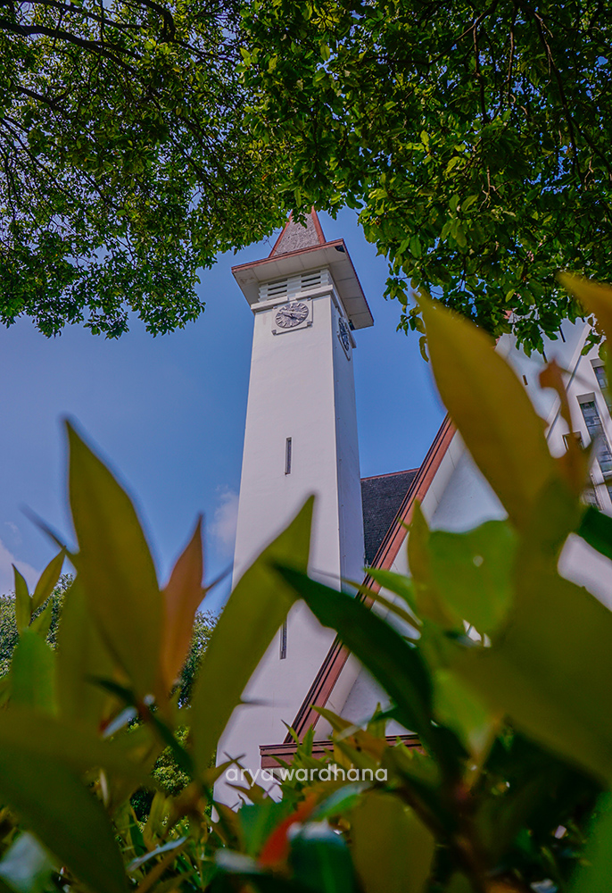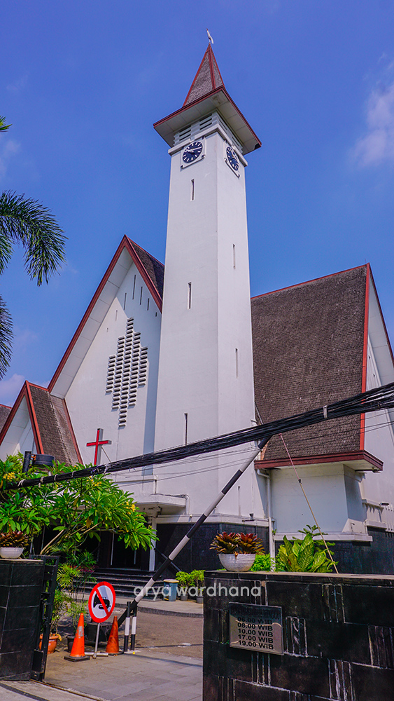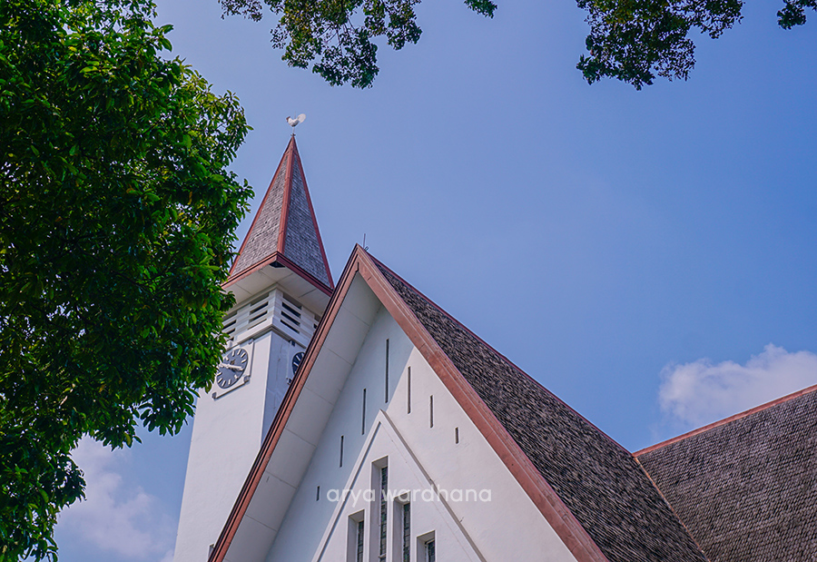 Ciri khas gereja ini adalah menaranya yang langsing dengan atap piramida runcing serta sempat buah jam besar di bawahnya yang sampai sekarang masih berfungsi. Bidangnya bentuk bujur sangkar yang merupakan konsep empat penjuru mata angin. Menurut ketua komisi pembangunan Ds. de Bruijn menyimbolkan “Hendaklah orang memikirkan hal-hal yang di atas, dan bukan pertama-tama hal-hal yang di bumi saja.” Denah bangunan gereja ini bentuk salib yang keempat sisinya sama panjang. Di bagian atas terdapat jendela mosaik dari kaca berwarna. Jika matahari bersinar, maka jendala mozaik ini seakan-akan menyebarkan sinar berwarna-warni seperti sapaan Tuhan. Interior bangunannya berkonsep klasik dengan warna dinding putih dan material kayu.