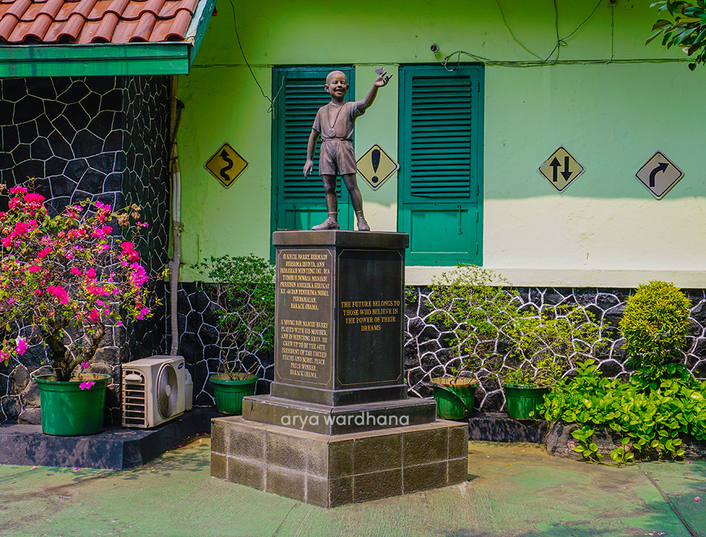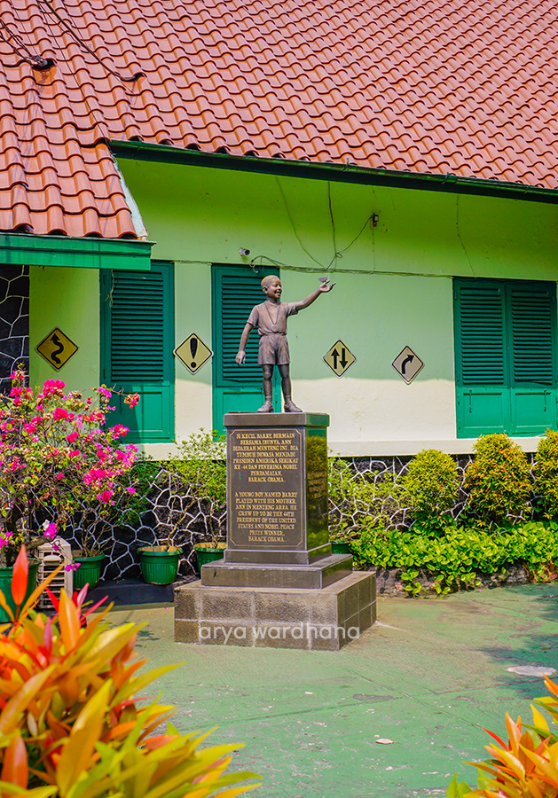 Nah di halaman sekolah ini, berdiri Patung Barack Obama atau Patung Barry Kecil. Patung ini menggambarkan sosok Barrack Soetoro (nama kecilnya dulu) saat berusia 10 tahun yang mengenakan celana pendek dan kaus, serta memegang kupu-kupu di tangan kirinya sebagai simbol harapan dan inspirasi bagi anak-anak Indonesia. Patung ini terbuat dari perunggu dengan ketinggian 2 meter dan dirancang oleh seniman Leo Angelo serta dipahat oleh pematung Edi Chaniago. Patung ini diprakarsai oleh dua teman kecil Obama, Ron Mullers dan Dalton Tanonaka, serta yayasan Friends of Obama. Biaya pembuatan patung ini mencapai 10.000 dolar Amerika dan diresmikan pada 10 Desember 2009, bertepatan dengan penganugerahan Nobel Perdamaian di Oslo, Norwegia.