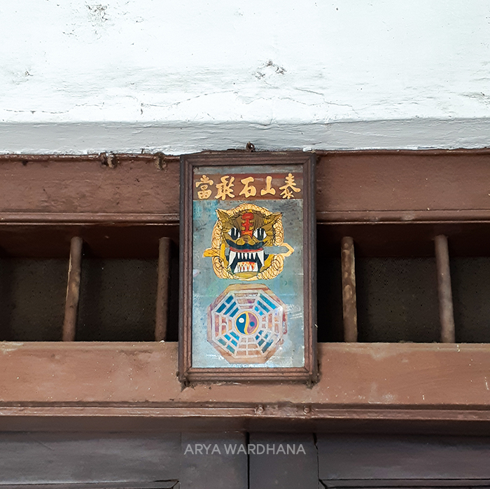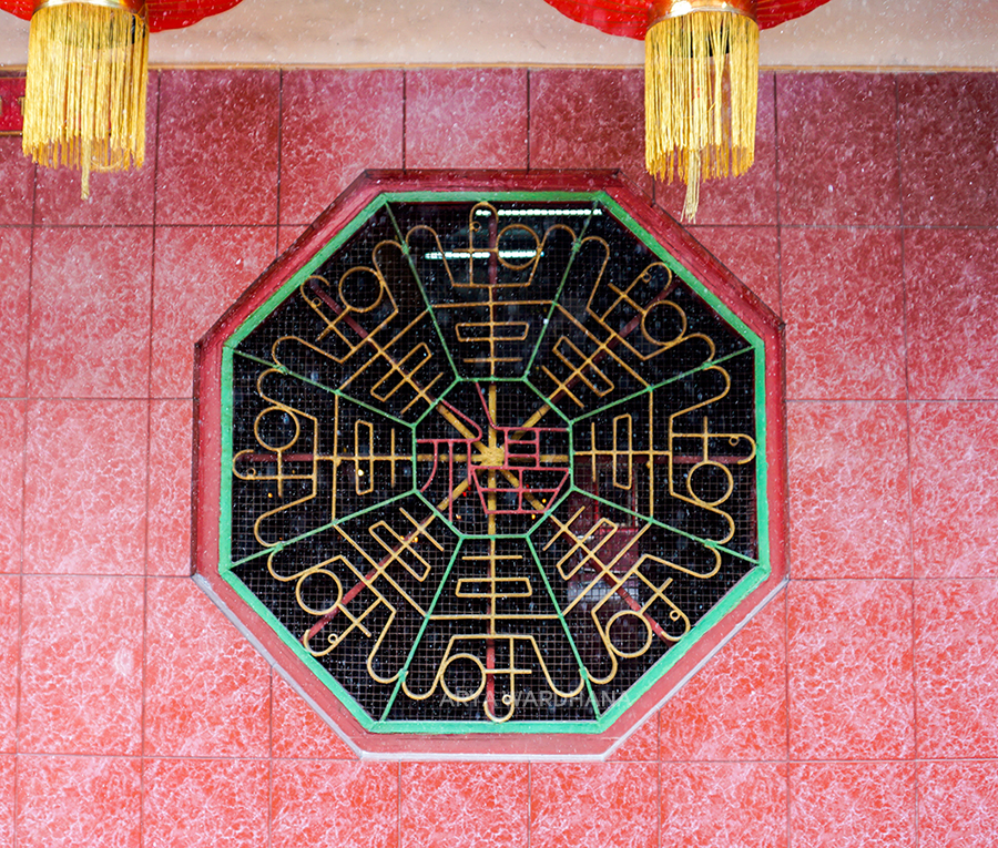 Selain itu yang menjadi ciri khas lainnya adalah penempatan cermin di atas pintu rumah. Nama cermin ini adalah cermin bagua. Fungsinya dalam ilmu feng shui adalah sebagai perlindungan dari energi negatif maupun keburuntugan bagi yang memasangnya. Cermin dengan bentuk oktagon ini memang memiliki dua fungsi, ini bisa dilihat dari bentuk cerminnya. Cembung untuk memantulkan energi negatif dan cekung untuk mengumpulkan energi positif.
