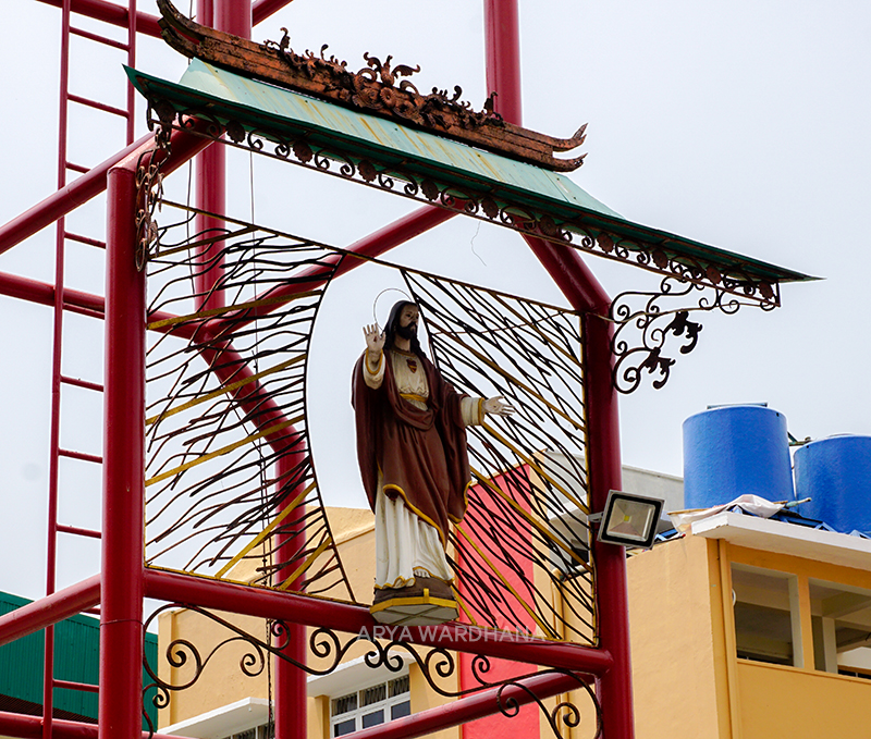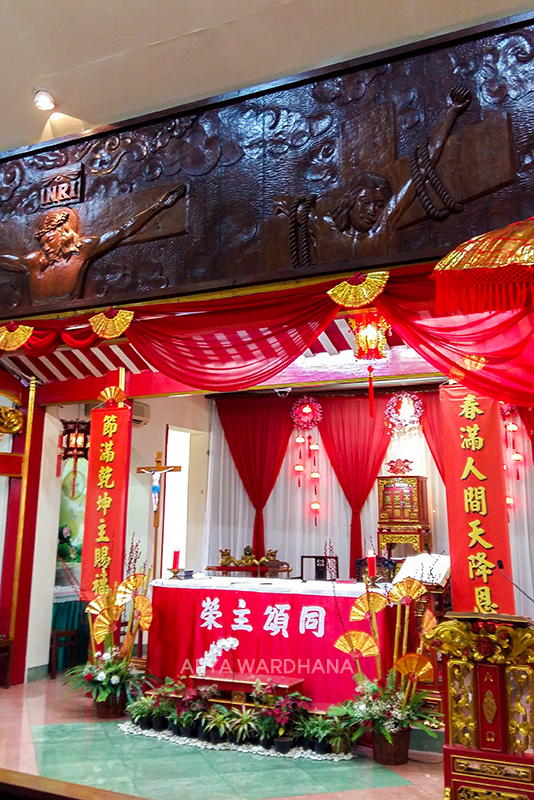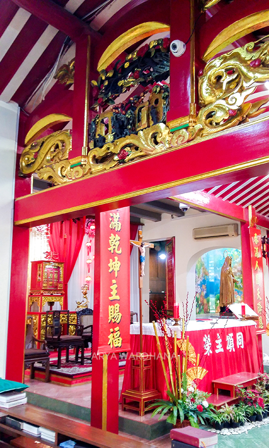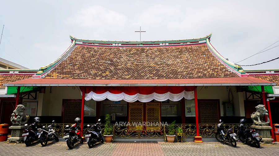 Beberapa arsitektur khas bangunan gereja ini, antara lain pelisir atapnya tampak tiga kombinasi warna, yaitu merah, hijau daun, dan kuning emas. Pada pelisir atap itu juga ada hiasan berupa bunga dan buah-buahan serta tulisan dalam huruf Tionghoa. Hiasan bunga dan buah-buahan bermakna kedamaian dan kesejahteraan. Sedangkan warna merah yang dominan berarti kegembiraan. Pada bagian pelisir atap bangunan utama (bagian depan) terdapat tulisan dalam huruf Tionghoa (dengan versi Kanton) Hok Shau Kang Ning, yang artinya rezeki, umur panjang, kesehatan, dan ketentraman, atau bisa juga dapat diartikan sebagai rumah atau tempat kedamaian. Di pelisir atap bangunan sayap kanan terdapat tulisan Chuan Chau Fu, diperkirakan merupakan nama keluarga pemilik bangunan itu. Di pelisir atap bangunan sayap kiri terdapat tulisan Nan An Shien, yang diperkirakan sebagai salah satu wilayah di Quanzhou, Provinsi Fujian, yang merupakan tempat asal keluarga Chuan tadi. Sedangkan di pelisir atap bangunan bagian belakang terdapat tulisan Hok Cia Phin An, yang berarti sekeluarga aman sentosa.