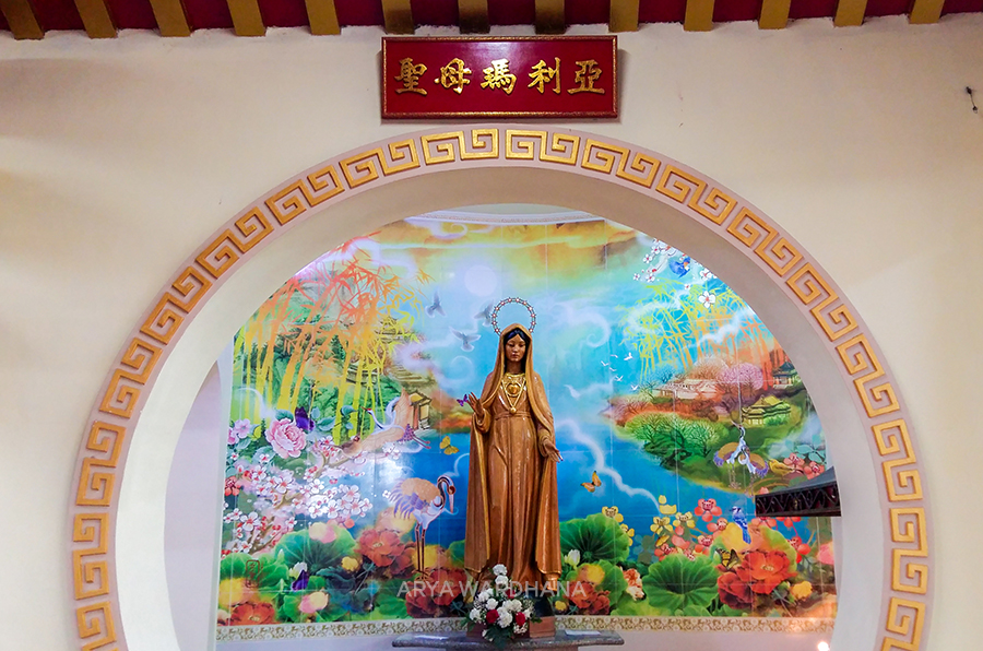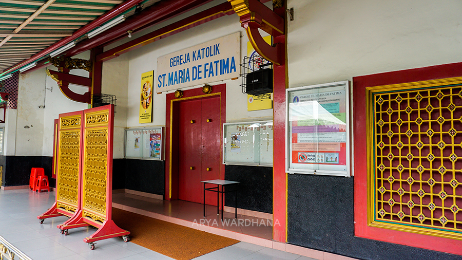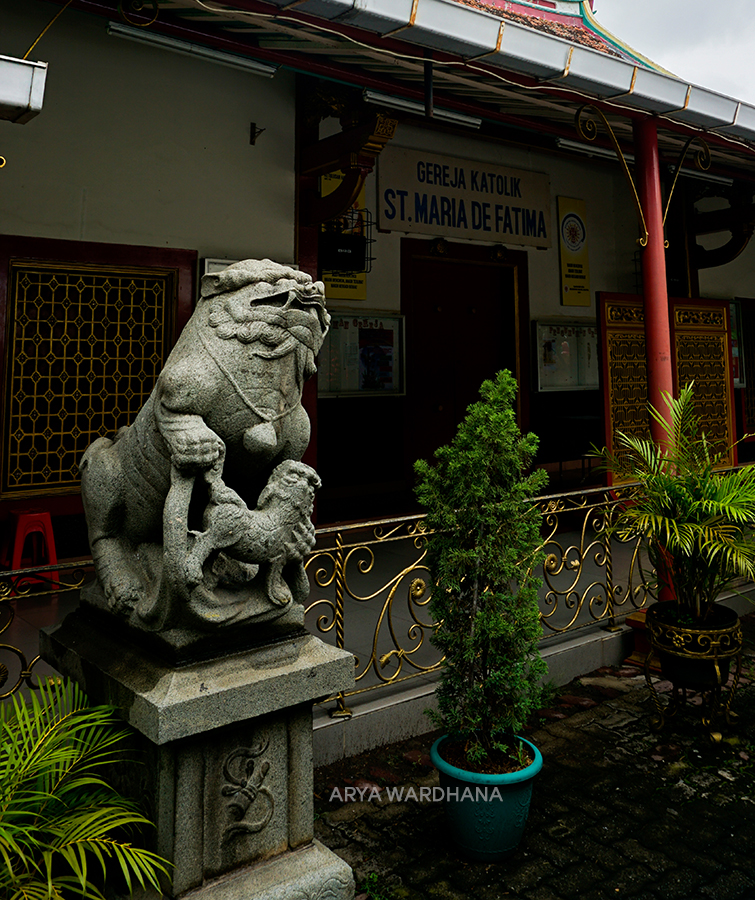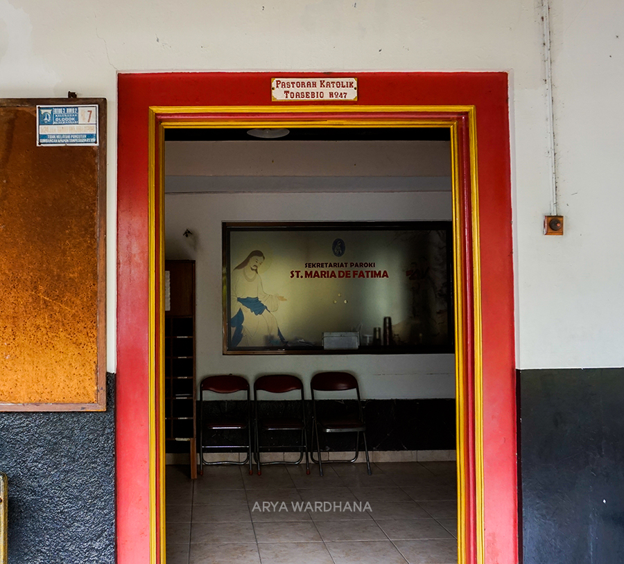 Masih di area Pecinan Glodok atau tepatnya di Jalan Kemenangan (dulunya bernama Toosebiostraat), terdapat bangunan gereja yang sangat unik. Gereja Katolik Santa Maria de Fatima atau Gereja Toasebio merupakan salah satu gereja tertua di Jakarta. Awalnya bangunan ini dibangun pada awal abad ke-19 oleh seorang Kapitan Tionghoa bermarga Tjioe yang berpangkat luitenant der Chineezen. Gaya bangunannya sendiri khas Fukien atau Tiongkok Selatan. Balok-balok kayunya sendiri didatangkan dari Tiongkok yang disambung hanya dengan pasak kayu. Bangunan ini terdiri dari satu bangunan utama beratap ekor walet, dua bangunan sayap, dan dua patung singa batu atau Bao Gu Shi di halaman depan. Patung singa sering dianggap sebagai lambang kemegahan bangsawan Tionghoa. Di antara bangunan utama dengan bangunan kedua terdapat ruang terbuka untuk tempat berkumpul keluarga atau tempat sembahyang bersama. Setelah dibeli oleh pihak Gereja, ruang terbuka itu ditutup dan dijadikan ruang gereja. Sementara tempat sembahyang keluarga dijadikan altar gereja dan bekas tempat penghormatan leluhur milik keluarga Tjioe dijadikan tabernakel gereja.
