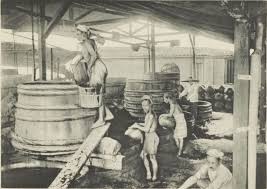 Suasana pabrik arak Batavia dan sebotol Batavia-Arrack van Oosten.