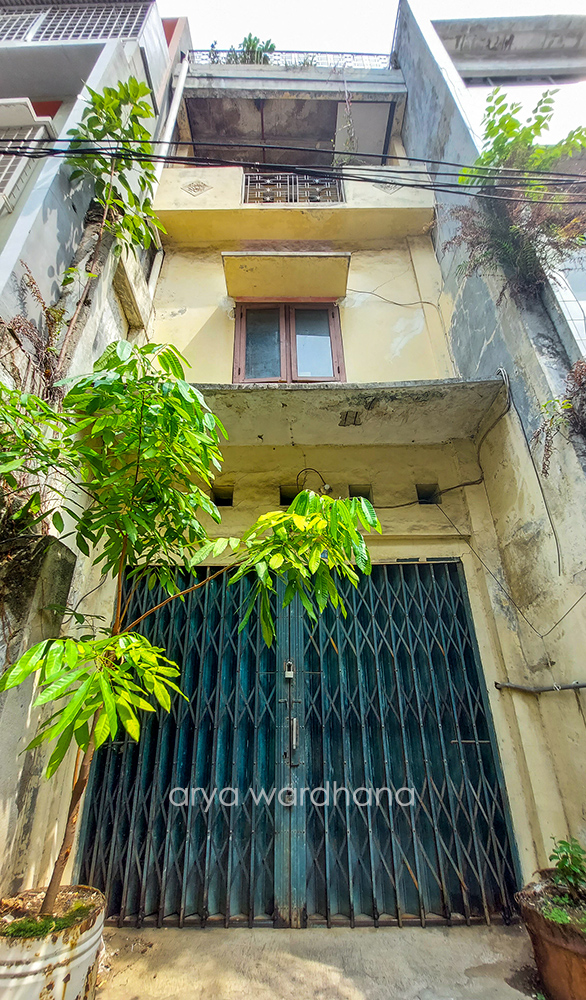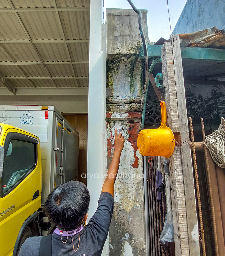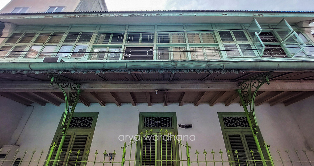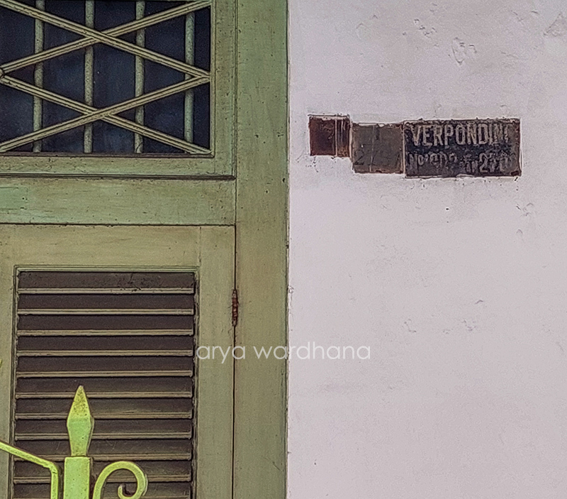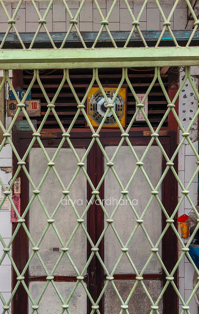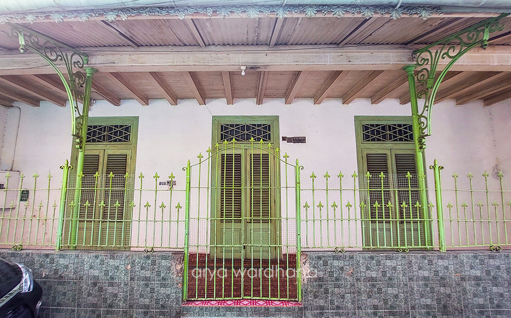 Bicara tentang bangunannya, rumah ini memiliki 3 pintu yang melambangkan tiga fase kehidupan, yaitu kelahiran, perkawinan dan kematian. Selain itu juga ada cermin di atas pintu yang fungsinya untuk menolak bala atau menghindari penghuninya dari hal-hal jahat. Hal ini lazim pada rumah-rumah yang dihuni oleh orang-orang Tionghoa. Oya, satu hal yang cukup unik adalah sebuah plakat batu yang bertuliskan “verponding” yang artinya pajak rumah di jaman Belanda.
