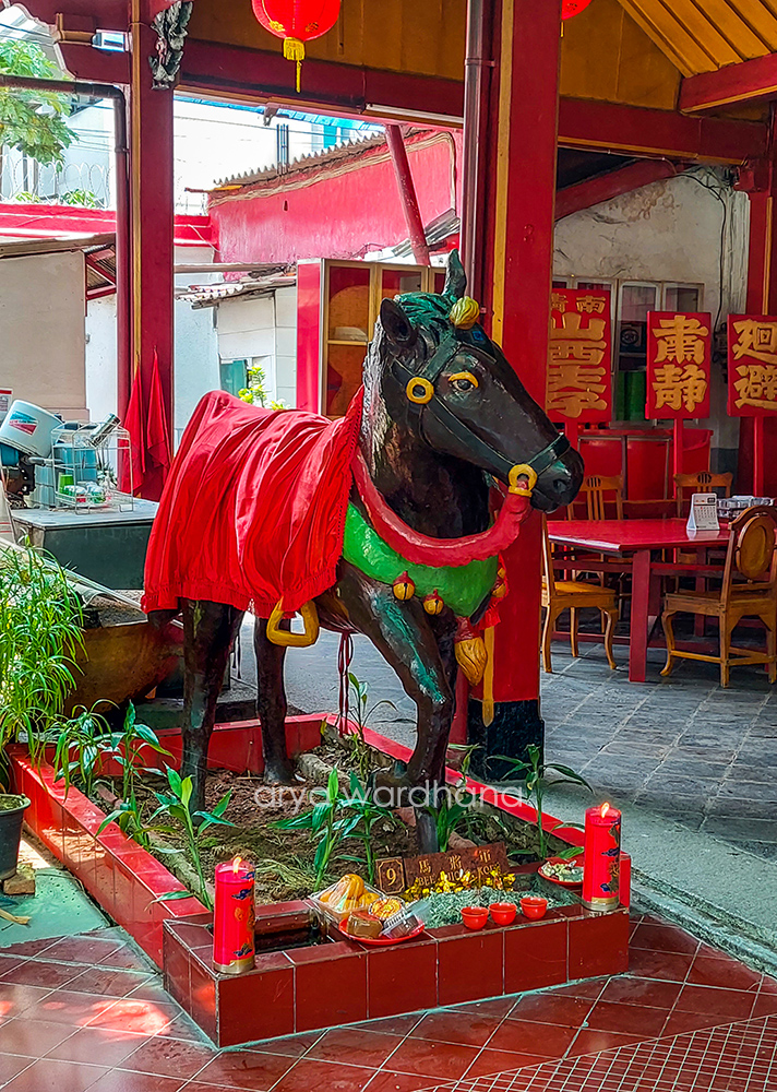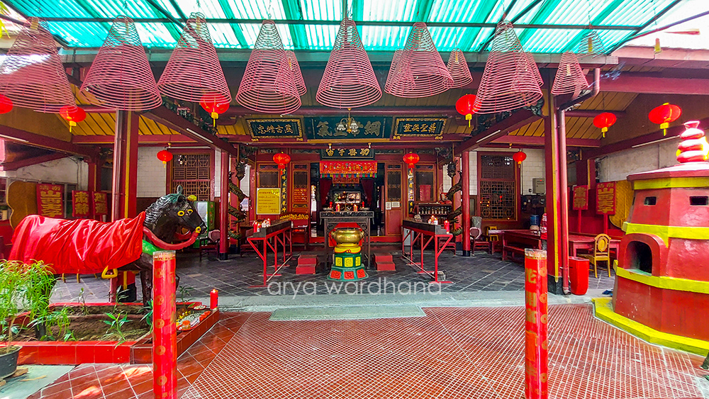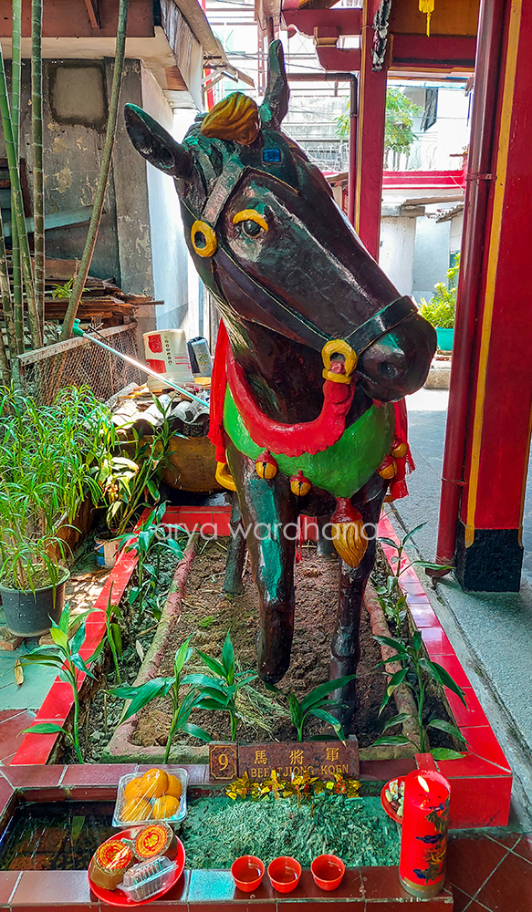 Nah, ada satu yang unik yaitu patung kuda berwarna hitam yang ada di bagian muka kelenteng. [UPDATE] Konon ini adalah kuda kesayangan dari Dewa Kwantong, yang menjadi dewa tuan rumah dari kelenteng ini. Dewa ini adalah dewa perang. Dalam cerita Samkok, sang dewa ini berhasil memenangkan perang dan ketika akan diberikan imbalan, dia justru meminta kuda paling cepat. Kuda ini adalah kuda hitam yang diberi nama Bee Tjiong Koen. Cerita tentang dewa ini ada di relief yang berada di gerbang masuk kelenteng.