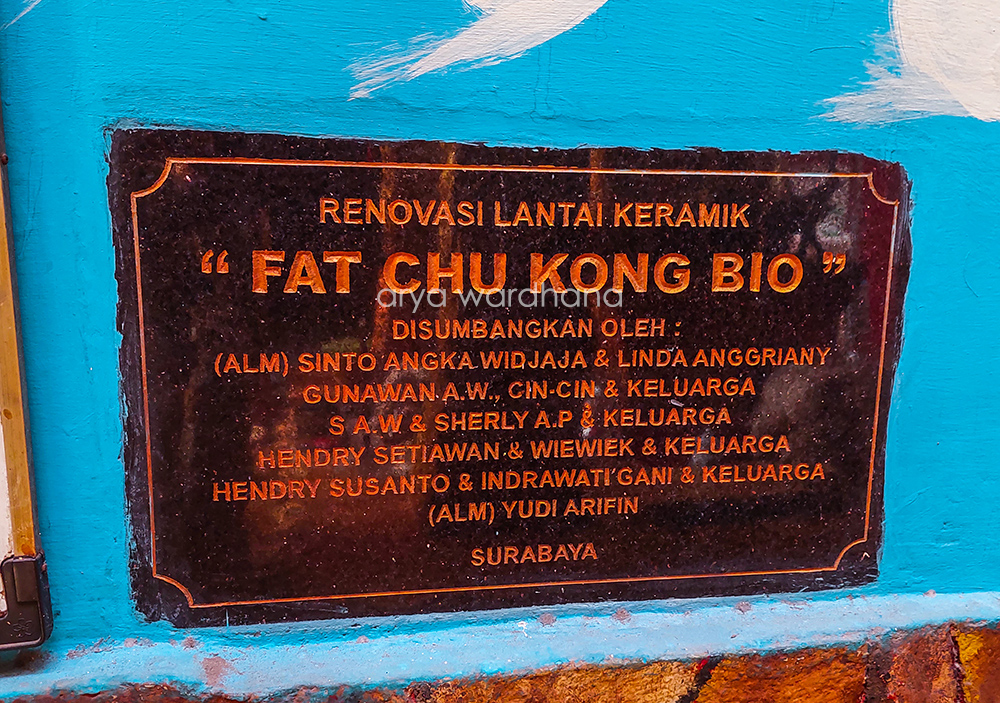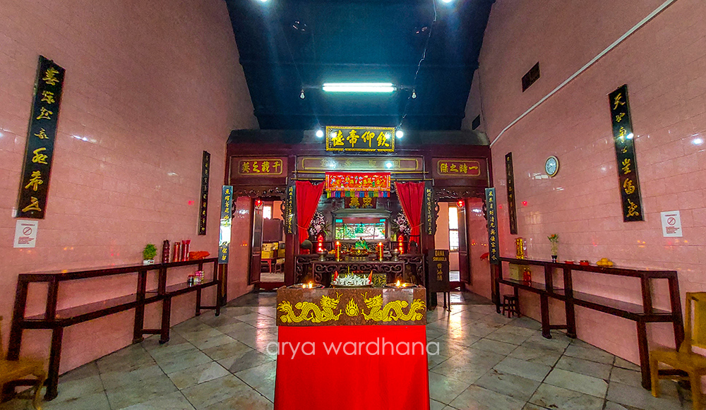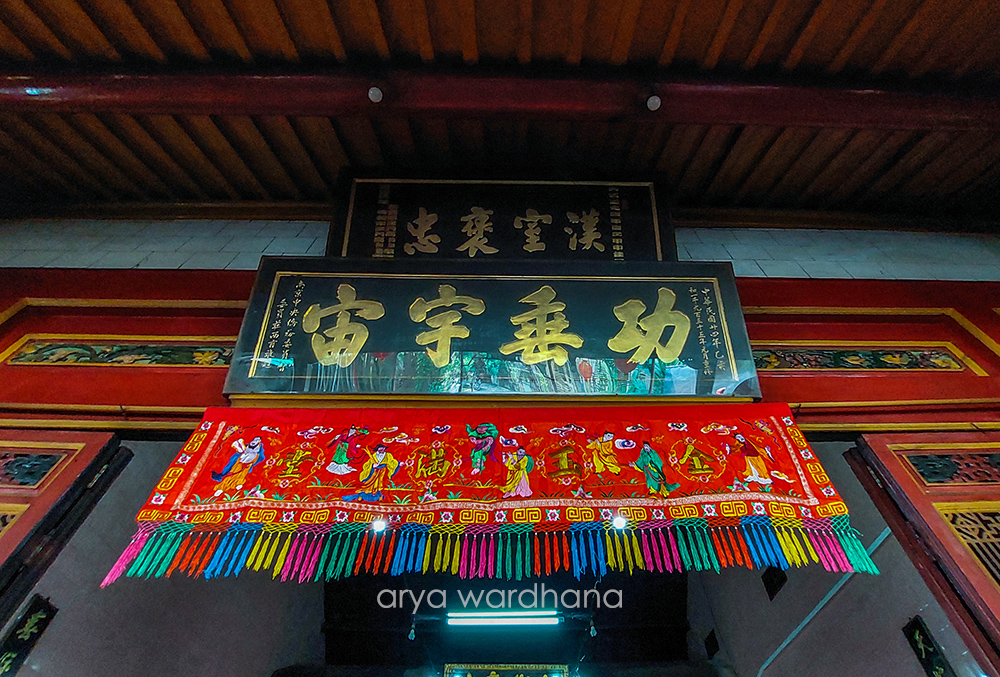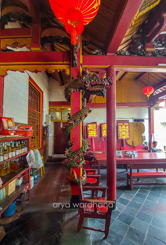 Bangunannya masih asli, termasuk untuk bagian lantainya. Hanya sebagian ornamen yang ditambahkan, seperti naga yang melilit di tiang. Ada sebuah plakat di sebelah kanan pintu masuk, yang menunjukkan diresmikannya kelenteng ini di tahun 1824. Uniknya untuk masuk ke dalam, di bawah pintu ada semacam palang kayu kecil. Kata Huans, dulu orang Tionghoa menggunakan baju yang cukup panjang. Jadi ketika masuk harus mengangkat bagian bawah bajunya dan secara otomatis kepalanya menunduk. Artinya ketika masuk kelenteng, menunduk diartikan sebagai menghormati dewa-dewa yang ada di dalamnya. Saat ini kelenteng masih dikelola oleh keluarga yang sama secara turun-temurun dan sekarang dikelola oleh generasi keenam. Mereka tinggal di sekitar kelenteng ini.