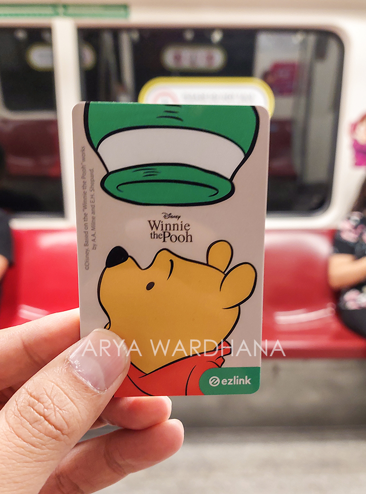 Tujuan pertama kami adalah ke kawasan Chinatown untuk check-in di hotel. Untuk menuju ke sana, kami naik MRT melalui T3. Tapi sebelumnya kami membeli EZ link card dulu. Kenapa akhirnya membeli? Karena saya punya pengalaman buruk dengan menggunakan kartu Jenius di perjalanan saya ke Singapura sebelumnya. Jadi pilih yang aman dengan membeli kartu ini. Lucunya kami berdua mendapat kartu bergambar Winnie the Pooh. Haha.