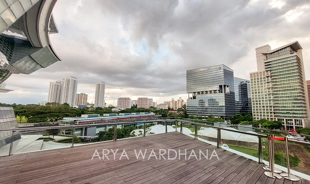 Setelah makan, kami segera bergegas kembali ke hotel untuk mandi dan istirahat sebentar. Sekitar jam 4 sore, kami naik MRT ke stasiun MRT Buona Vista untuk menuju ke The Star Performing Arts Centre yang berada di The Star Vista. Nah, ada yang menarik dari tempat konser Sigur Ros di Singapura ini. The Star Vista merupakan pusat perbelanjaan dengan desain yang sangat unik hasil rancangan Andrew Bromberg. Mall yang dibuka pada 2012 ini juga mendapatkan penghargaan Green Mark Gold dari Singapore Building and Construction Authority. Kalau kita melihat bangunan di salah satu sisi akan tampak simetris, tapi jika dilihat dari sisi lainnya akan tampak seperti bangunan yang tidak stabil. Mall ini terbilang enak untuk duduk-duduk santai karena open air dan teduh, selain itu bagian atasnya ada semacam balkon untuk melihat pemandangan di sekitar The Star Vista.