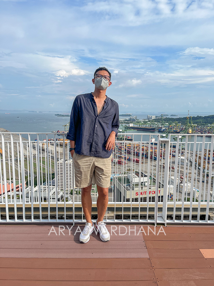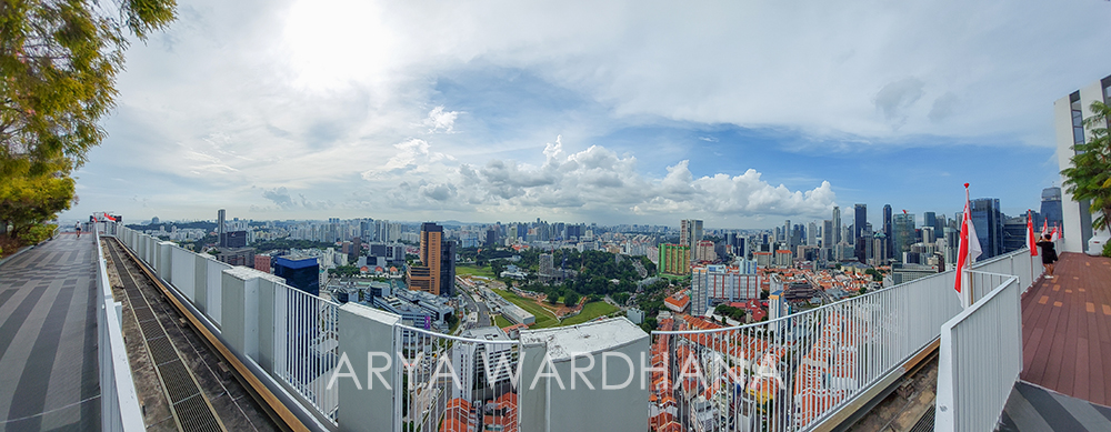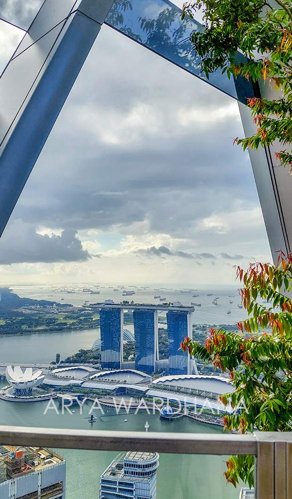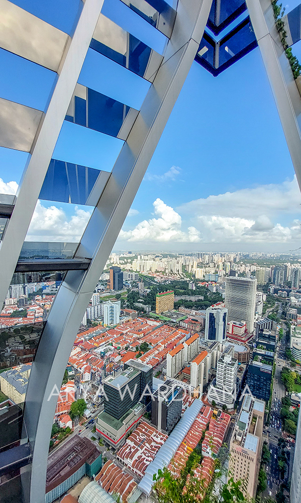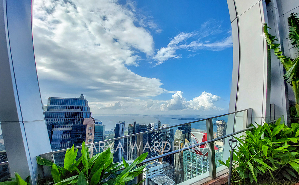 Sesampainya di lantai 50, kita akan menemukan sebuah pintu yang harus di-tap dengan kartu tadi. Ingat ya, hanya bisa sekali tap. Lalu sampailah kita ke area sky garden. Perlu kalian perhatikan, di atas jika cuaca cerah akan terasa cukup panas, selain itu anginnya berhembus cukup kencang. Beruntungnya saat kami naik, cuacanya cerah tapi teduh, meski anginnya berhembus kencang. Kami masuk melalui tower paling selatan. Pemandangan yang langsung kita lihat adalah Tanjong Pagar Terminal, sebuah area pelabuhan peti kemas, serta 2 terminal lainnya di kejauhan, yaitu Keppel dan Brani. Lebih jauh lagi, kalian bisa melihat Pulau Sentosa. Sisi sebelah timur, ada banyak gedung tinggi dari kawasan CBD. Selain itu kita bisa melihat Marina Bay Sands di kejauhan. Lalu di sebelah utara, pemandangannya langsung ke Chinatown dan juga pusat kota. Sedangkan sebelah barat, lebih banyak didominasi dengan pemandangan perkotaan dan gedung-gedung apartemen, serta Singapore General Hospital.