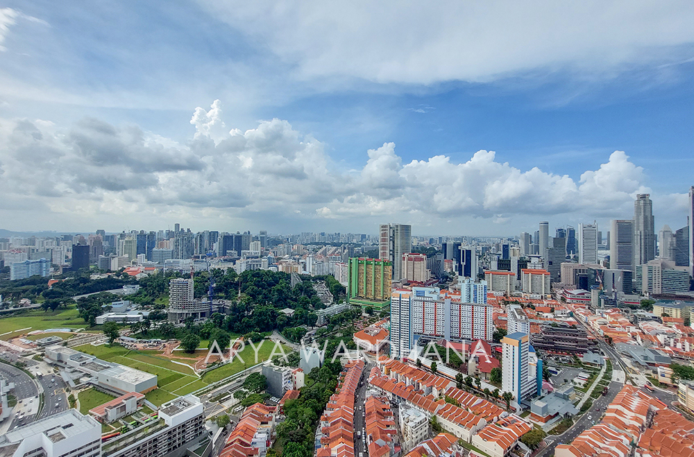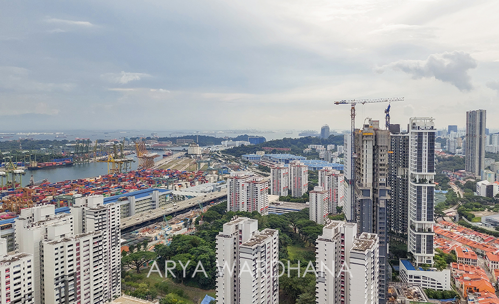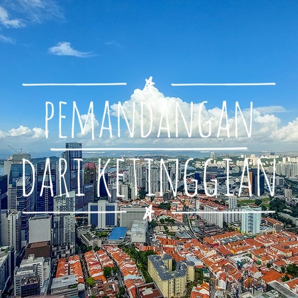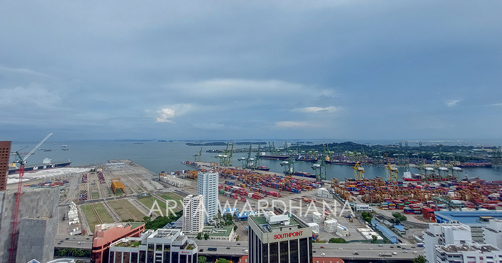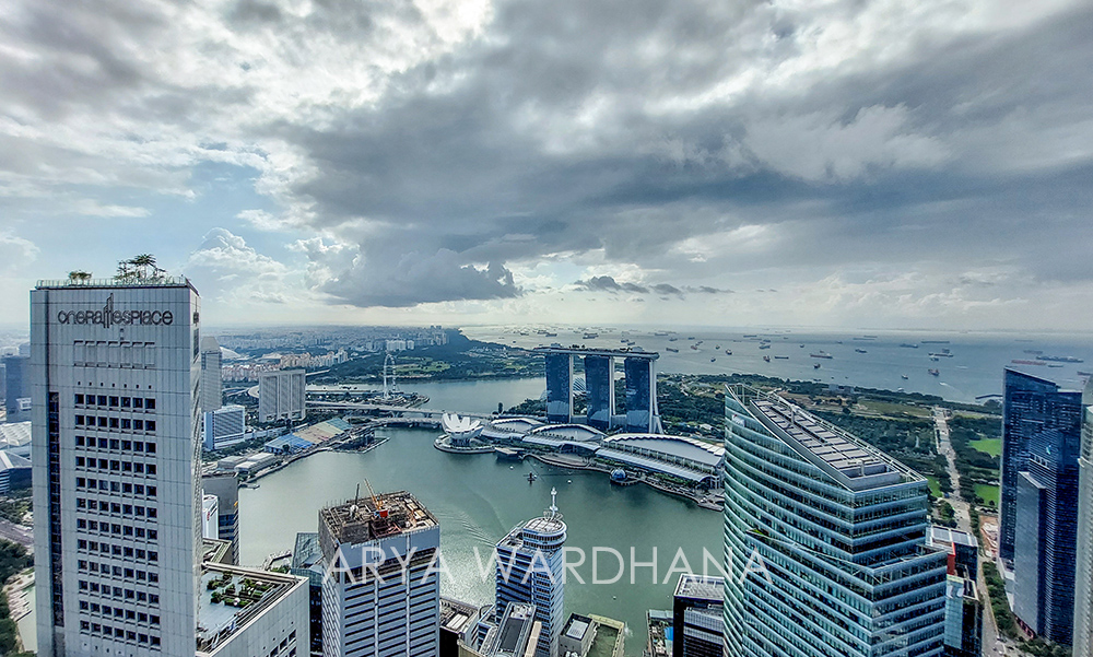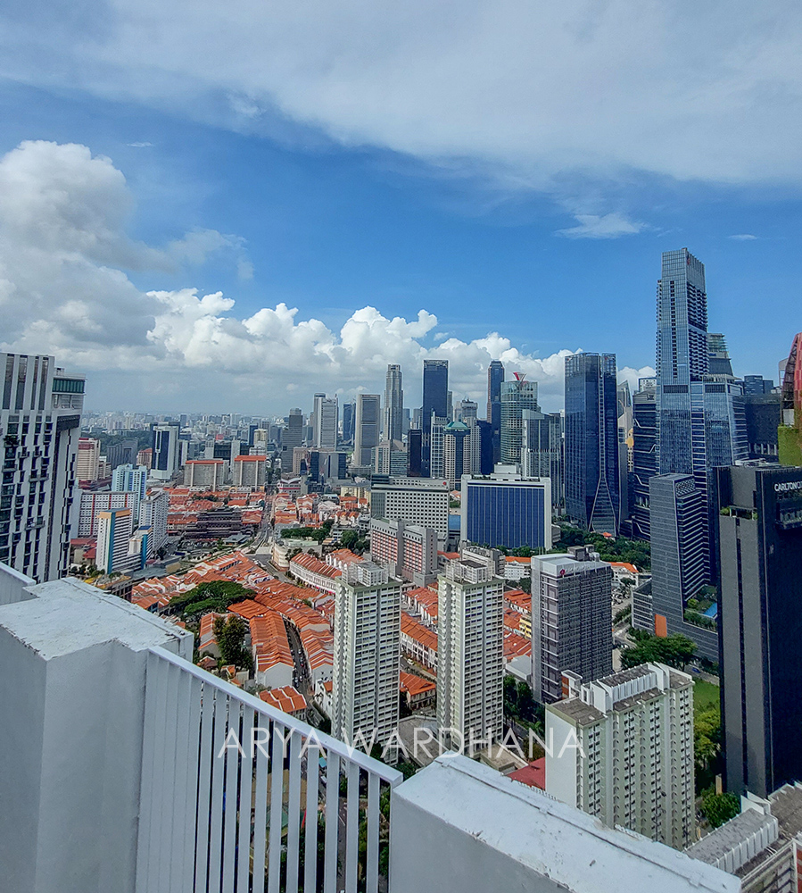 Sesampainya di lantai 50, kita akan menemukan sebuah pintu yang harus di-tap dengan kartu tadi. Ingat ya, hanya bisa sekali tap. Lalu sampailah kita ke area sky garden. Perlu kalian perhatikan, di atas jika cuaca cerah akan terasa cukup panas, selain itu anginnya berhembus cukup kencang. Beruntungnya saat kami naik, cuacanya cerah tapi teduh, meski anginnya berhembus kencang. Kami masuk melalui tower paling selatan. Pemandangan yang langsung kita lihat adalah Tanjong Pagar Terminal, sebuah area pelabuhan peti kemas, serta 2 terminal lainnya di kejauhan, yaitu Keppel dan Brani. Lebih jauh lagi, kalian bisa melihat Pulau Sentosa. Sisi sebelah timur, ada banyak gedung tinggi dari kawasan CBD. Selain itu kita bisa melihat Marina Bay Sands di kejauhan. Lalu di sebelah utara, pemandangannya langsung ke Chinatown dan juga pusat kota. Sedangkan sebelah barat, lebih banyak didominasi dengan pemandangan perkotaan dan gedung-gedung apartemen, serta Singapore General Hospital.