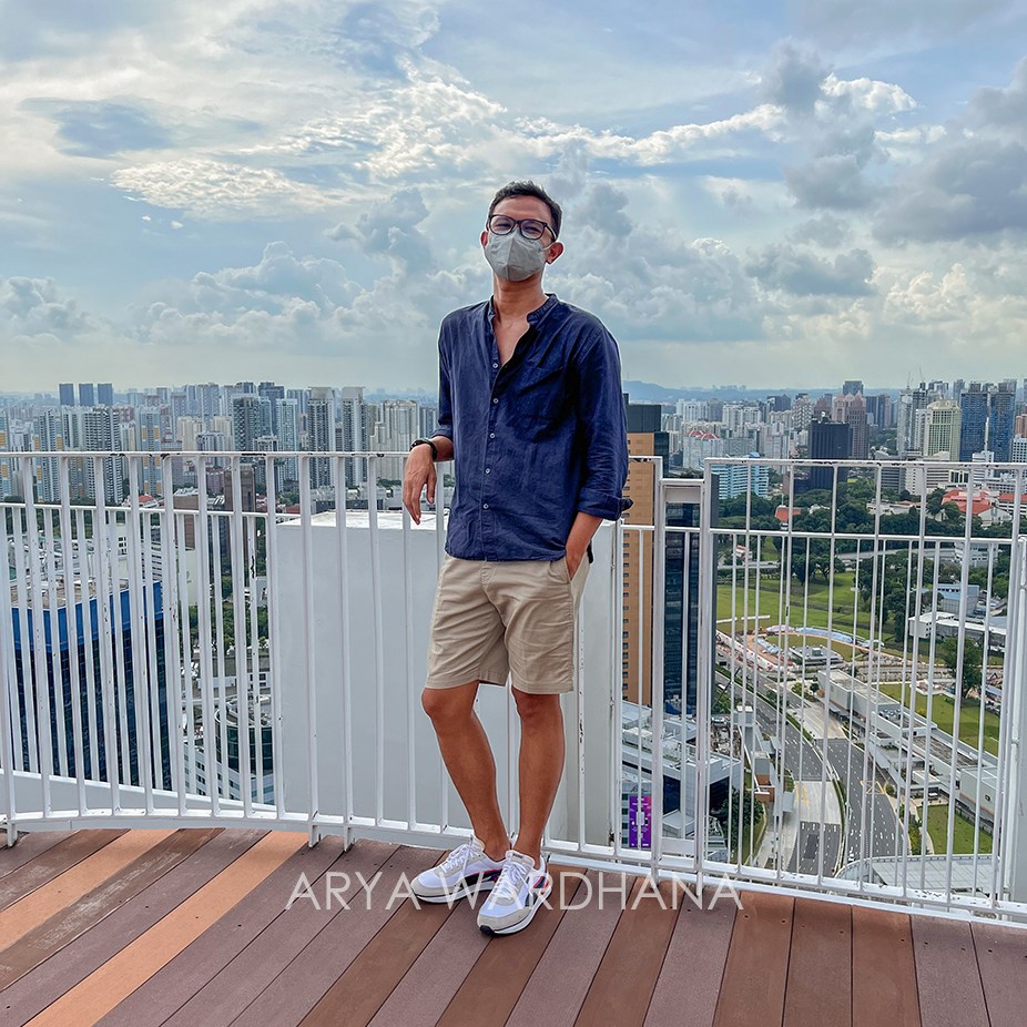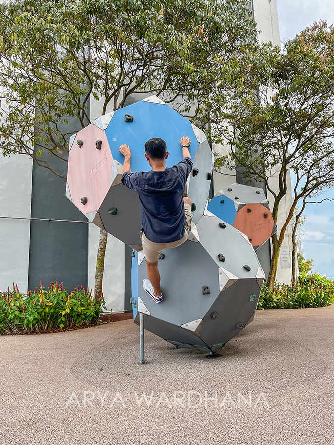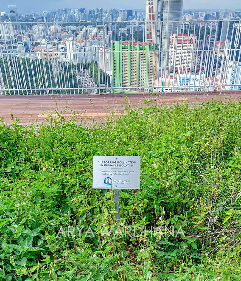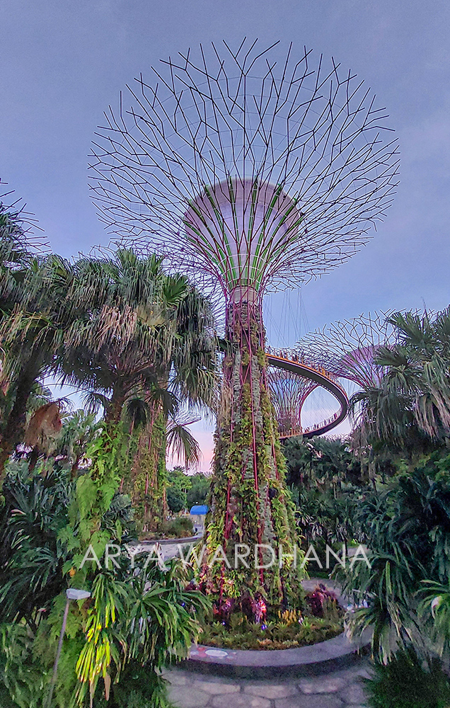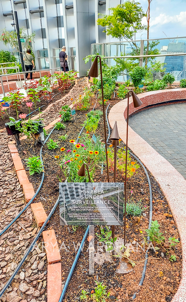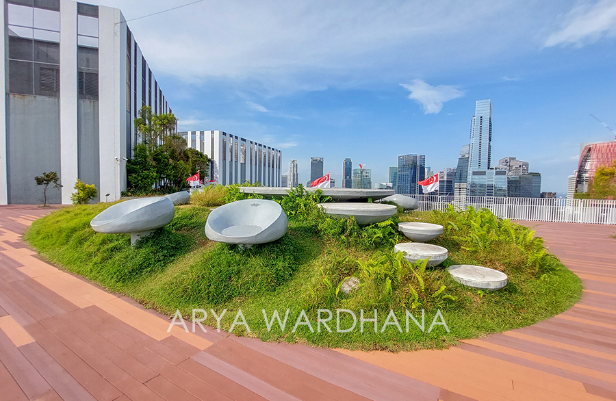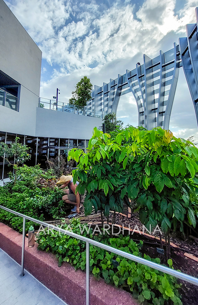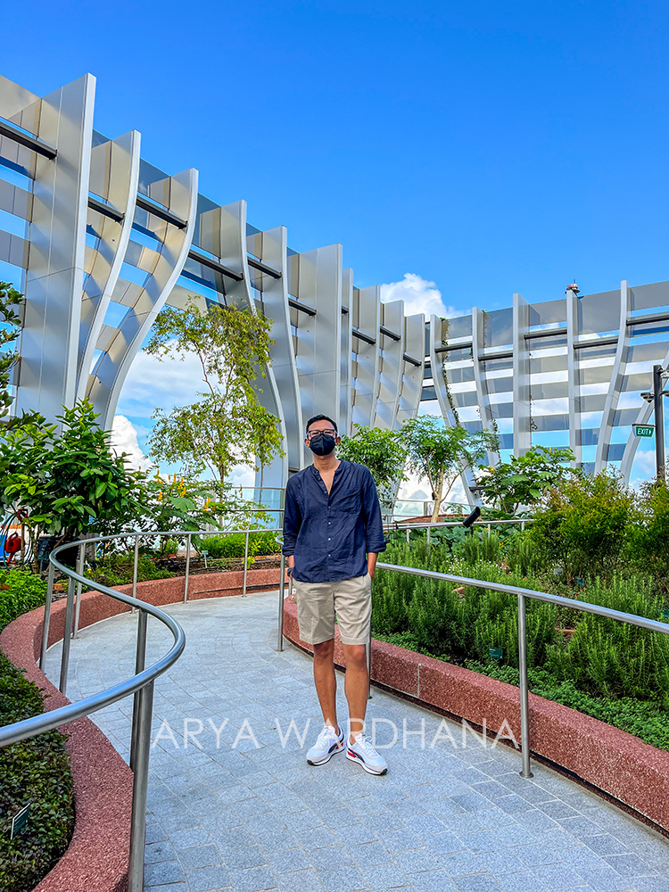Meskipun tidak bisa melihat secara jelas karena masih terhalang kaca sebagai pembatas, tapi kita bisa cukup jelas melihat suasana Singapura dari ketinggian, dengan catatan cuacanya sedang cerah ya. Di Sky Garden ini juga ada lahan pertanian kota atau urban farming dengan luas 1.371 meter persegi. Lahan ini disebut-sebut sebagai urban farm tertinggi di Singapura. Ada sekitar 80.000 tanaman yang ditanam di sini. Uniknya, lahan pertanian ini memasok buah-buahan, rempah-rempah, sayuran, dan bunga yang dapat dimakan untuk tiga restoran yang ada di lantai 51 ini. Kalau kalian punya anggaran lebih, mungkin bisa mencoba salah satunya. Tinggal pilih, ada 1-Arden Food Forest, Australian Kaarla, dan Japanese Oumi. Kalau kalian makan di salah satu resto ini, kalian bisa menikmati pemandangan sore hari yang hanya bisa dinikmati oleh pengunjung resto.