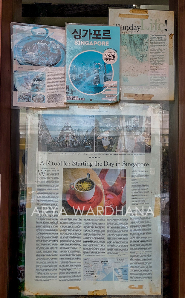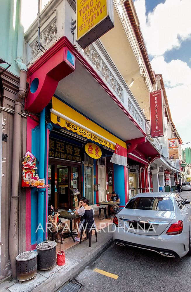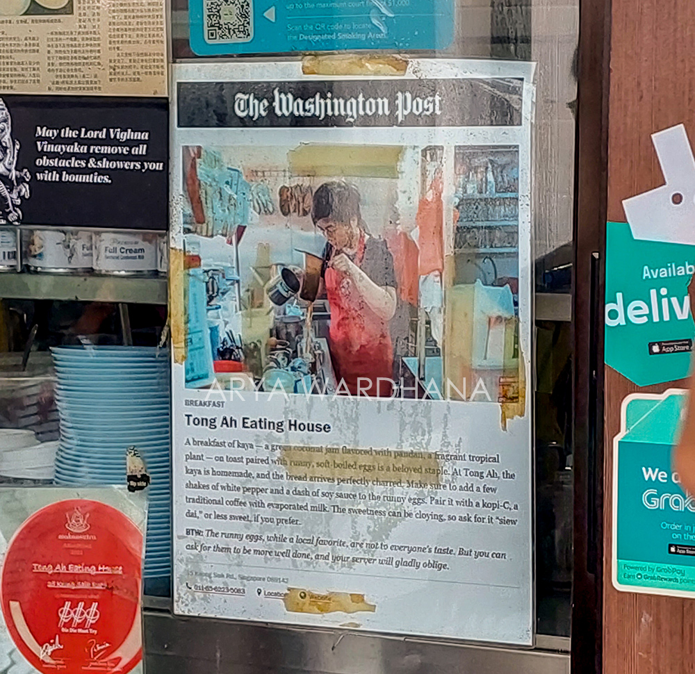 Nah, untuk memulai hari kami berjalan kaki ke Keong Saik Road. Bukan mau ke Potato Head Singapore ya tapi hendak sarapan di Tong Ah Eating House. Seperti yang saya singgung tadi, salah satu resto yang cukup dikenal di sini adalah Potato Head Singapore, yang ternyata masih ada hubungannya dengan kopitiam yang kami mau datangi, yang lokasinya berada di seberangnya. Jadi kopitiam ini usianya lebih dari 75 tahun. Berdiri di 1939 dan awalnya menempati bangunan yang sekarang menjadi Potato Head Singapore. Namun karena ada investor asing yang membeli bangunan ini, Tang Chew Fue atau Ah Wee, sang pemilik kopitiam lalu memindahkan kedai kopinya di tempat sekarang sejak 2013. Padahal bangunan ini diwariskan oleh kakek buyut keluarganya. Ah Wee sendiri merupakan generasi keempat dan mengambil alih kepemilikan kedai kopi dari ayahnya di 1999.
