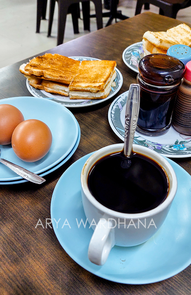 Menu yang jadi andalan di kopitiam ini adalah roti bakar, bahkan diberi penghargaan sebagai “Most Crispy Kaya Toast in Singapore”. Tapi sebenarnya, pengalaman sarapan ala warga lokal menjadi salah satu pengalaman yang menarik di sini. Kami memesan paket Traditional Kaya Toast plus Kopi O. Kaya Toast-nya cukup enak, roti bakar tipis kering yang diolesi selai srikaya dan juga yang hanya diolesi mentega. Paket ini termasuk telur setengah matang. Untuk selainya dibuat sendiri dengan cara dimasak menggunakan api kecil selama kurang lebih 10 jam dan terus diaduk tanpa henti.
