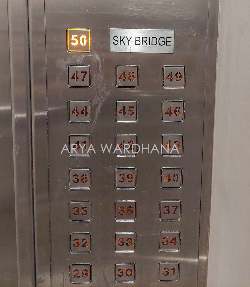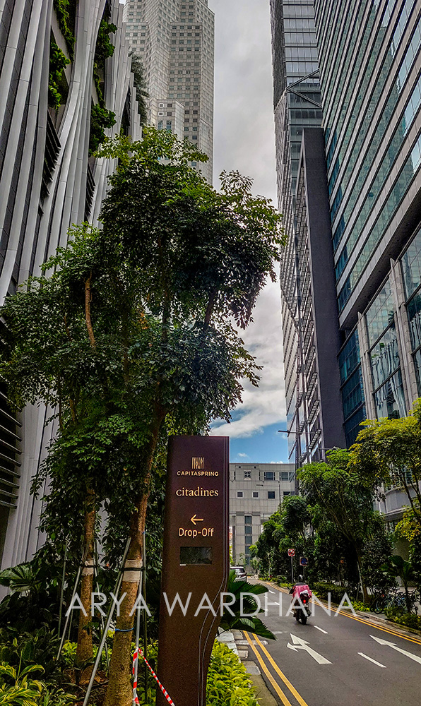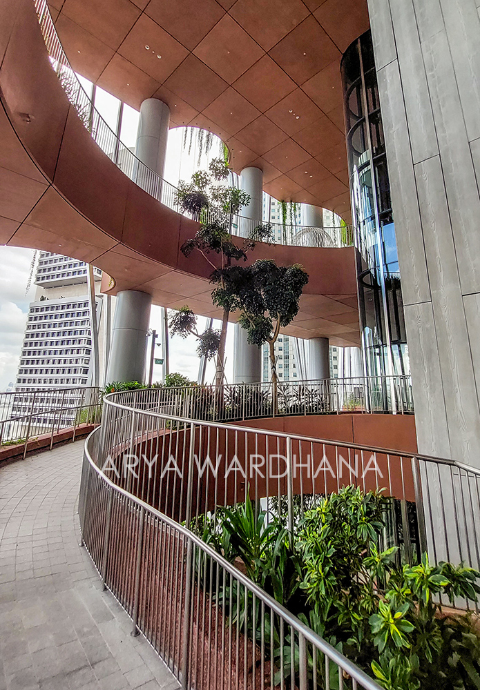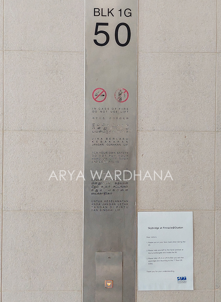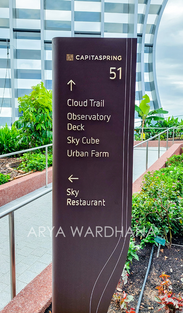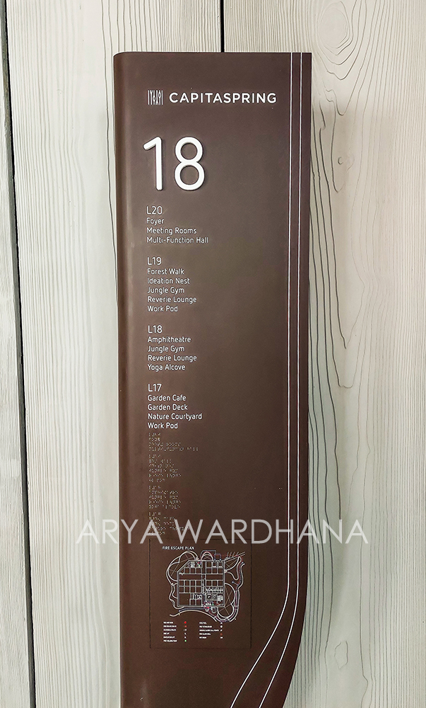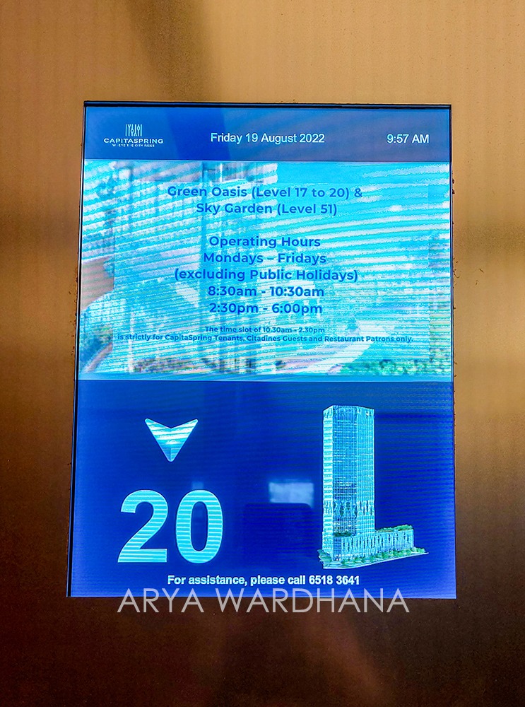 Oya, tadi lupa ya bilang caranya menuju ke Sky Garden dan Green Oasis. Sepertinya yang saya bilang tadi, dua lokasi ini gratis dan masuknya melalui lobi CapitaSpring, Kallian cukup menuju ke sebuah lift yang berada di sebelah kiri resepsionis (sangat mencolok karena ada videotron yang tertempel di dinding luar). Nanti kalian bisa langsung pilih mau ke lantai berapa. Tapi di sini tidak semua lantai ya, karena tombolnya sudah ditentukan. Jam bukanya ada dua sesi, pertama jam 8.30-10.30 pagi dan kedua jam 2.30 siang sampai 6 sore. Untuk slot jam 10.30 pagi sampai 2.30 siang hanya diperuntukan untuk para penyewa CapitaSpring, penghuni apartemen Citadine Raffles Place, dan pengunjung restoran. Kalau selepas jam 6 sore hanya dikhususkan untuk pengunjung restoran saja.