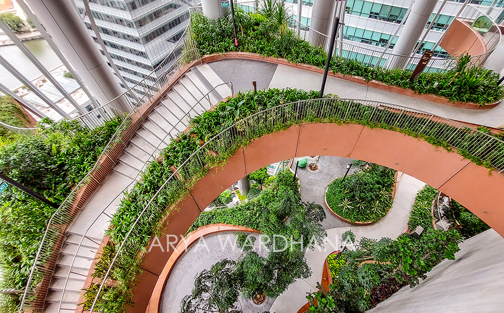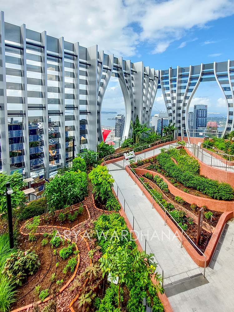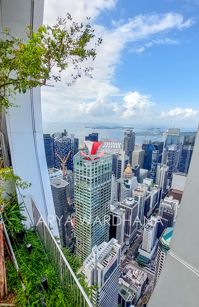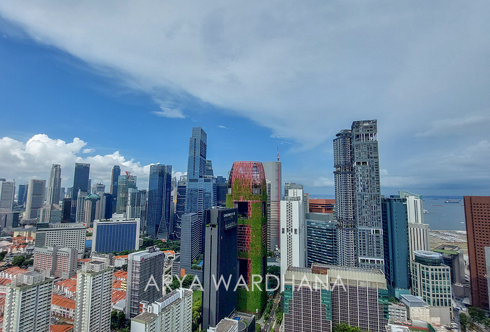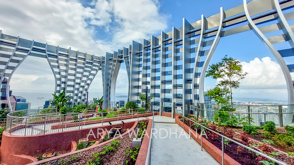 Apa saja yang ada di sini? Ada lokasi menarik yang bisa kalian datangi dengan gratis di sini, pertama adalah Sky Garden di lantai 51 atau rooftop gedung ini, dan kedua adalah Green Oasis yang menempati 4 lantai gedung ini, yaitu lantai 17 sampai 20. Di Sky Garden, kita bisa berjalan melalui jalan setapak yang dibangun mengelilingi rooftop sambil melihat pemandangan 360 derajat kota Singapura. Untuk berkeliling, kita membutuhkan waktu sekitar 10-15 menit, tergantung jika kalian ingin berhenti di titik-titik tertentu ya. Jika kalian melihat ke arah barat, kalian bisa melihat bangunan Pinnacle@Duxton dan juga kawasan Chinatown. Di arah utara, ada Orchard Road, Singapore River, dan Bukit Timah di kejauhan. Nah kalo di arah timur ada Marina Bay Sands. Sedangkan di utara, ada pelabuhan dan di kejauhan tampak Pulau Sentosa.