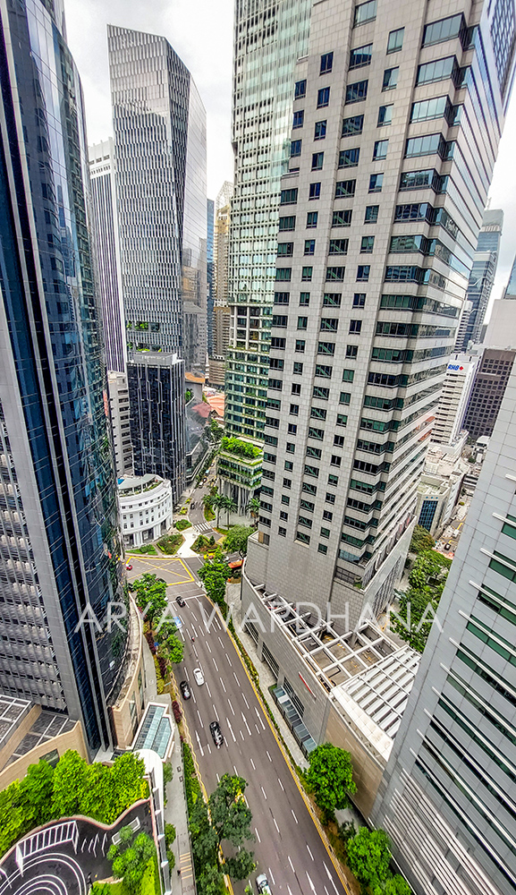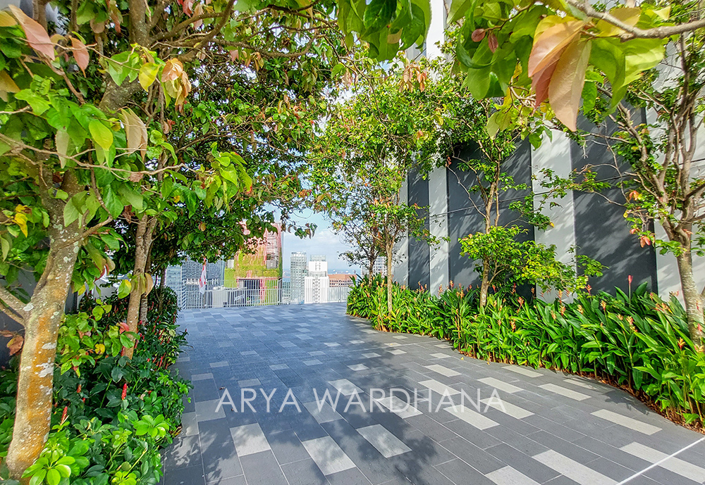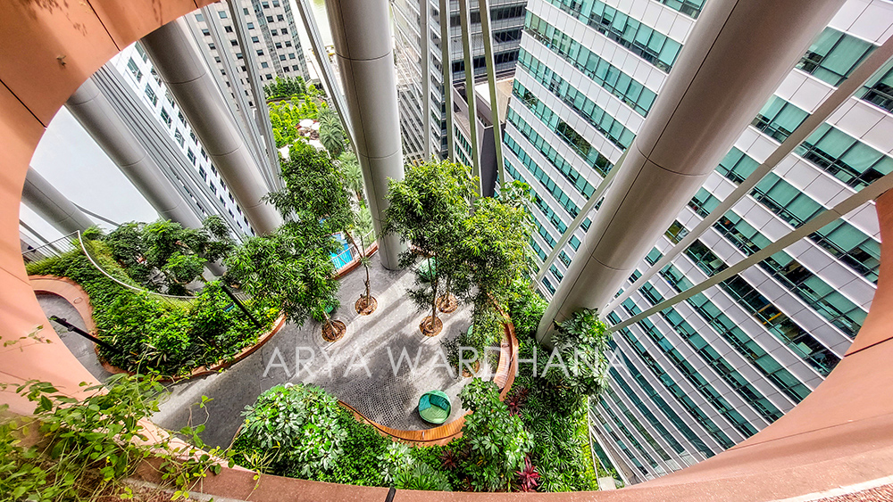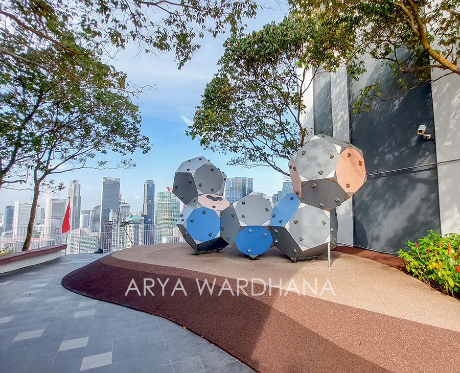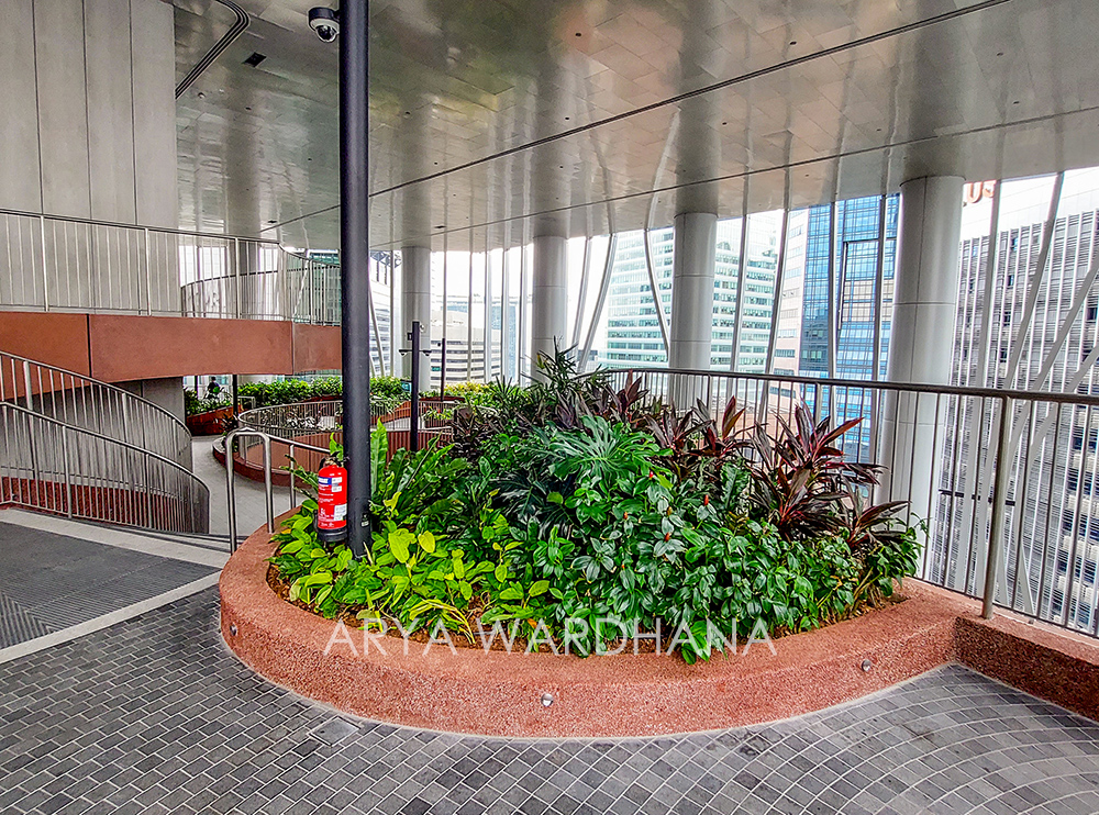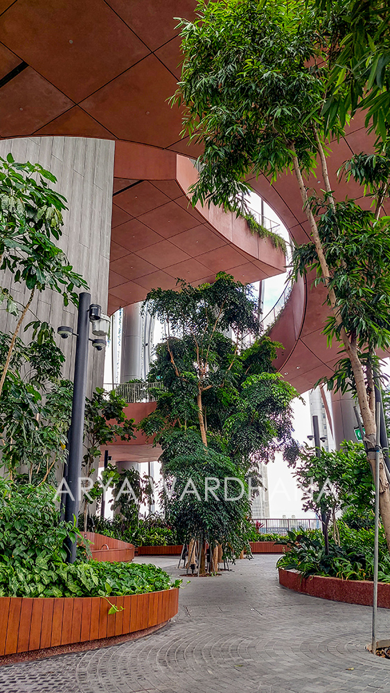 Apa saja yang ada di sini? Ada lokasi menarik yang bisa kalian datangi dengan gratis di sini, pertama adalah Sky Garden di lantai 51 atau rooftop gedung ini, dan kedua adalah Green Oasis yang menempati 4 lantai gedung ini, yaitu lantai 17 sampai 20. Di Sky Garden, kita bisa berjalan melalui jalan setapak yang dibangun mengelilingi rooftop sambil melihat pemandangan 360 derajat kota Singapura. Untuk berkeliling, kita membutuhkan waktu sekitar 10-15 menit, tergantung jika kalian ingin berhenti di titik-titik tertentu ya. Jika kalian melihat ke arah barat, kalian bisa melihat bangunan Pinnacle@Duxton dan juga kawasan Chinatown. Di arah utara, ada Orchard Road, Singapore River, dan Bukit Timah di kejauhan. Nah kalo di arah timur ada Marina Bay Sands. Sedangkan di utara, ada pelabuhan dan di kejauhan tampak Pulau Sentosa.
