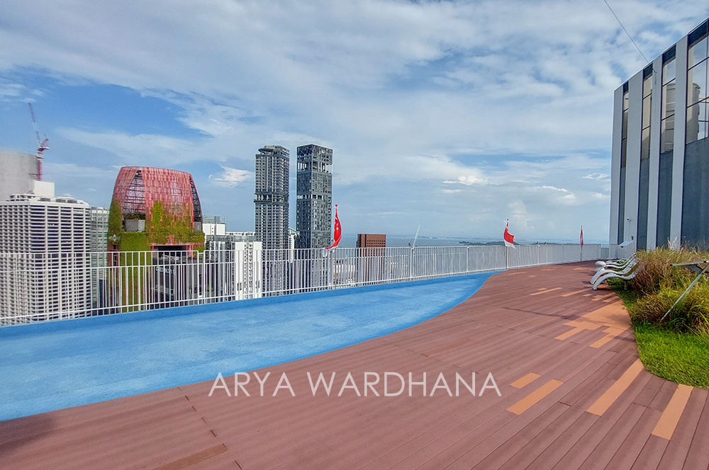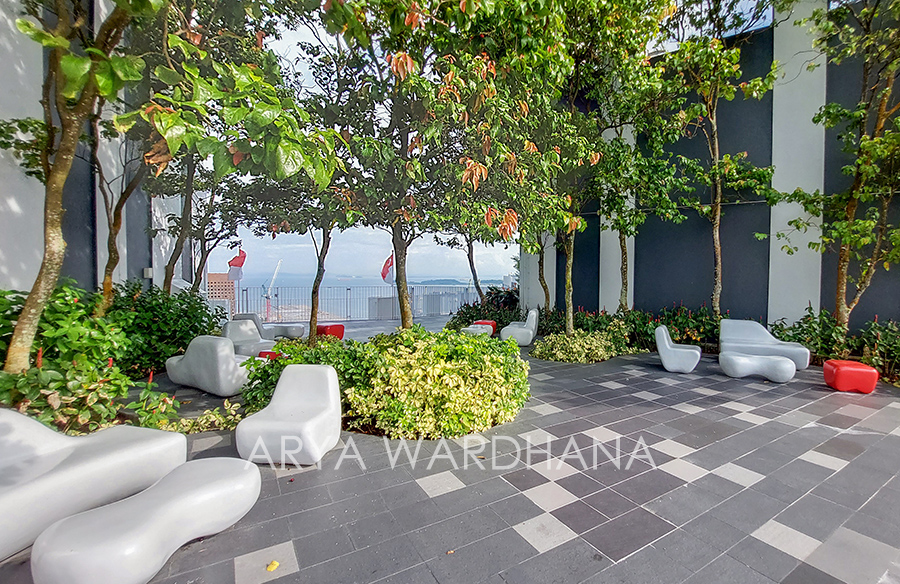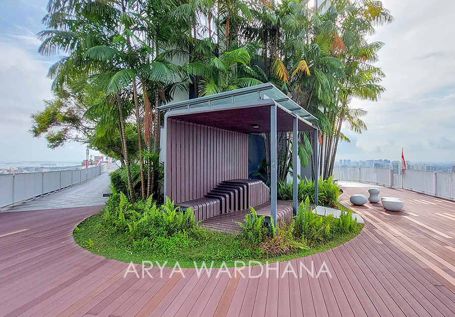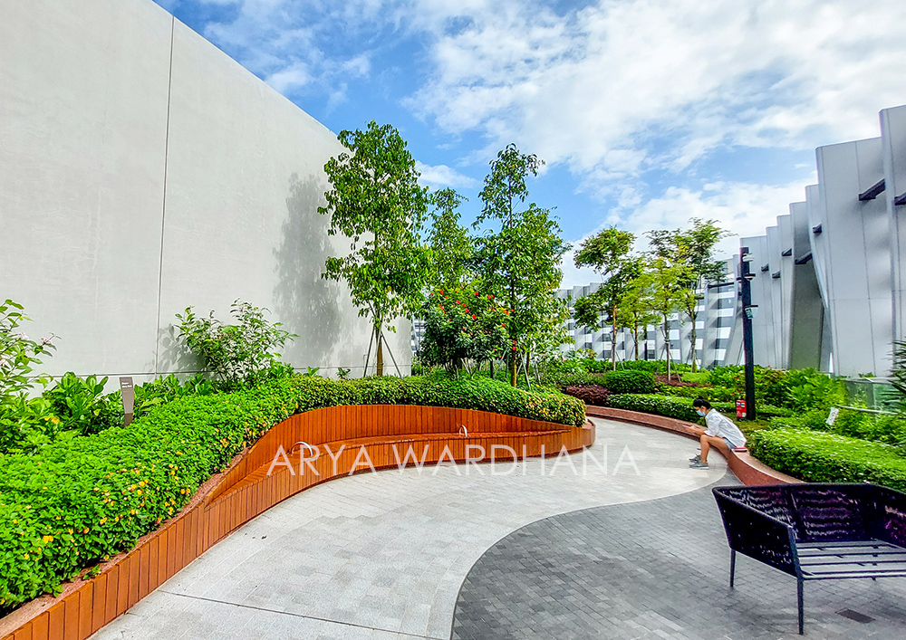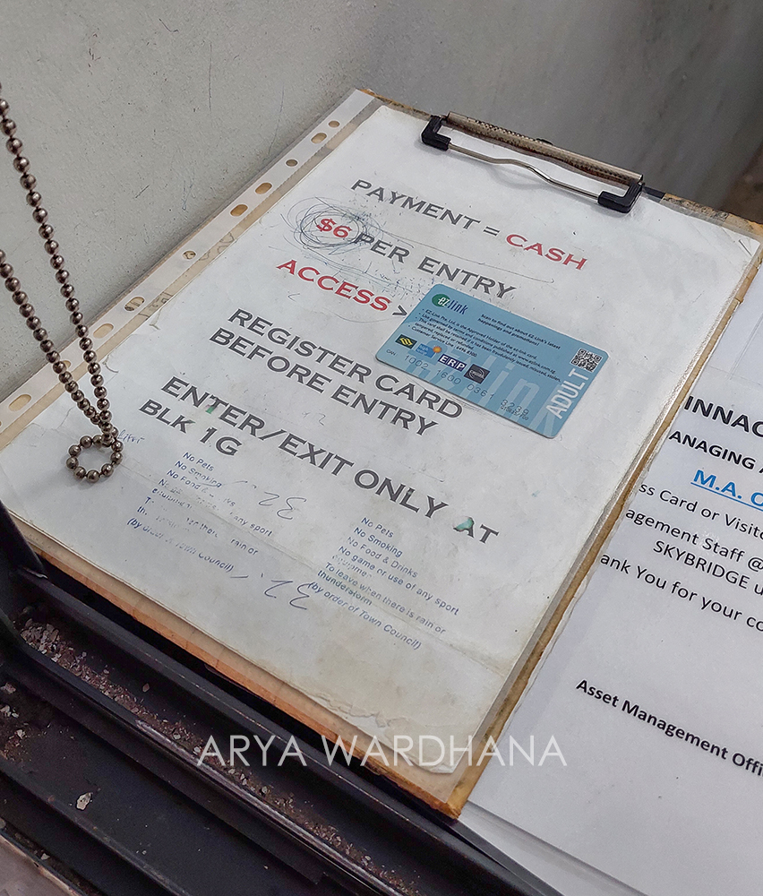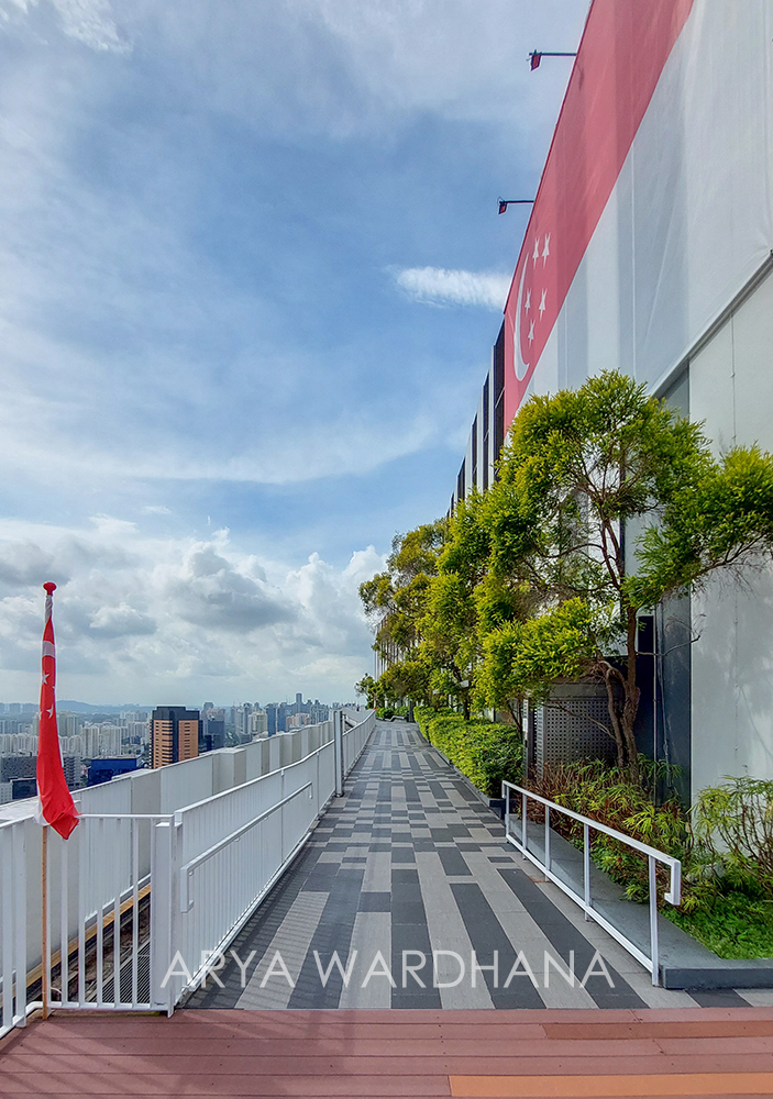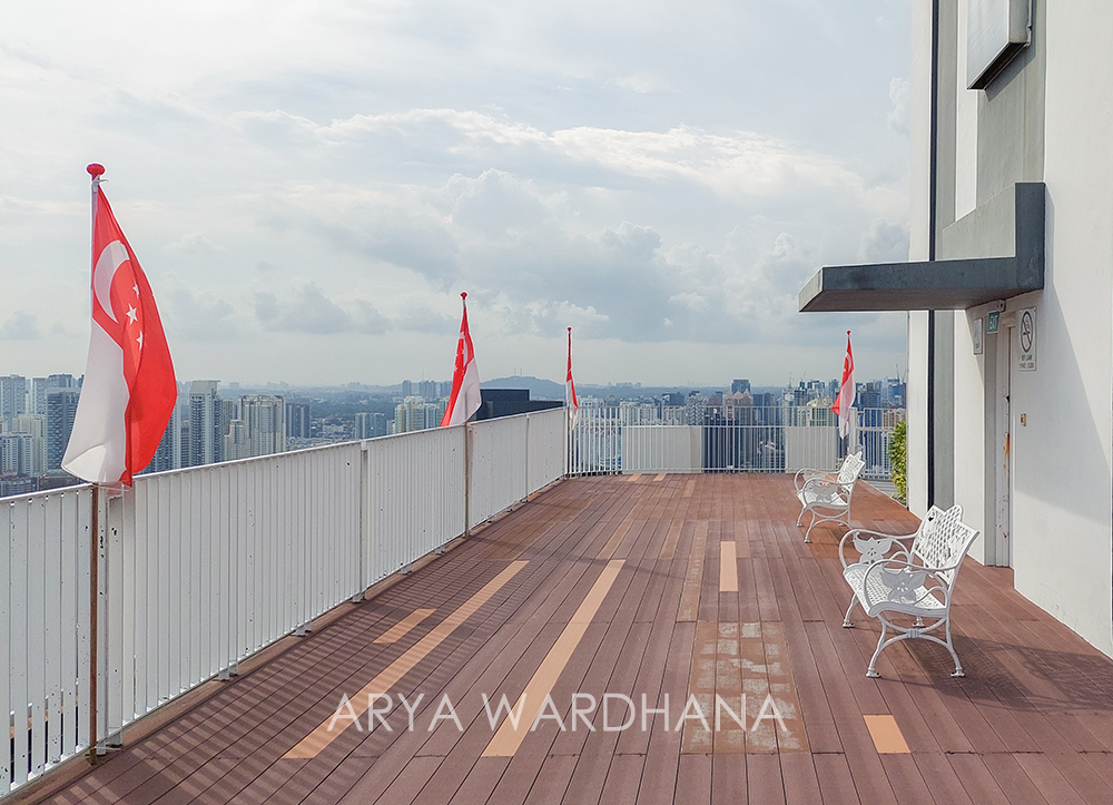 Di sky garden lantai 50 tersedia fasilitas jogging track dan berbagai taman dengan tema yang berbeda-beda. Jika cuaca cerah, kita bisa menikmati pemandangan kota dari berbagai sudut. Tapi kalau sedang cuaca buruk, kita tidak boleh naik ke atas. Lalu, bagaimana caranya untuk naik ke atas? Jadi kalian datang saja ke Managing Agent (MA) Office yang berada di Blok 1G, lantai 1. Lokasinya agak masuk ke dalam, tapi ada papan petunjuknya. Di sini kalian harus mendaftarkan diri dulu dengan membawa kartu yang masuk dalam Singapore Standard of Contactless ePurse Application (CEPAS), salah satunya EZ Link dan membayar biaya masuk sebesar SGD6 per orang (hanya untuk sekali naik ya, kalau berulang ya bayar lagi). Tanpa CEPAS tadi kalian tidak bisa masuk, karena aksesnya akan didaftarkan melalui kartu tadi. Setelah beres didaftarkan, kartu kita tadi bisa digunakan untuk mengakses lift yang berada di belakang kantor. Oya, lift yang dipakai ini adalah lift untuk penghuni juga. Untuk kartu yang sudah didaftarkan masa berlakunya sampai 1 jam sebelum dipakai untuk tap-in. Kalau sudah lewat, ya kalian harus daftar dan bayar lagi.