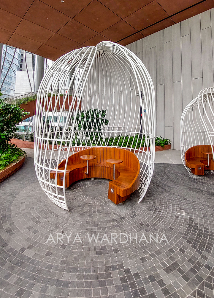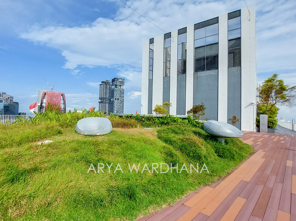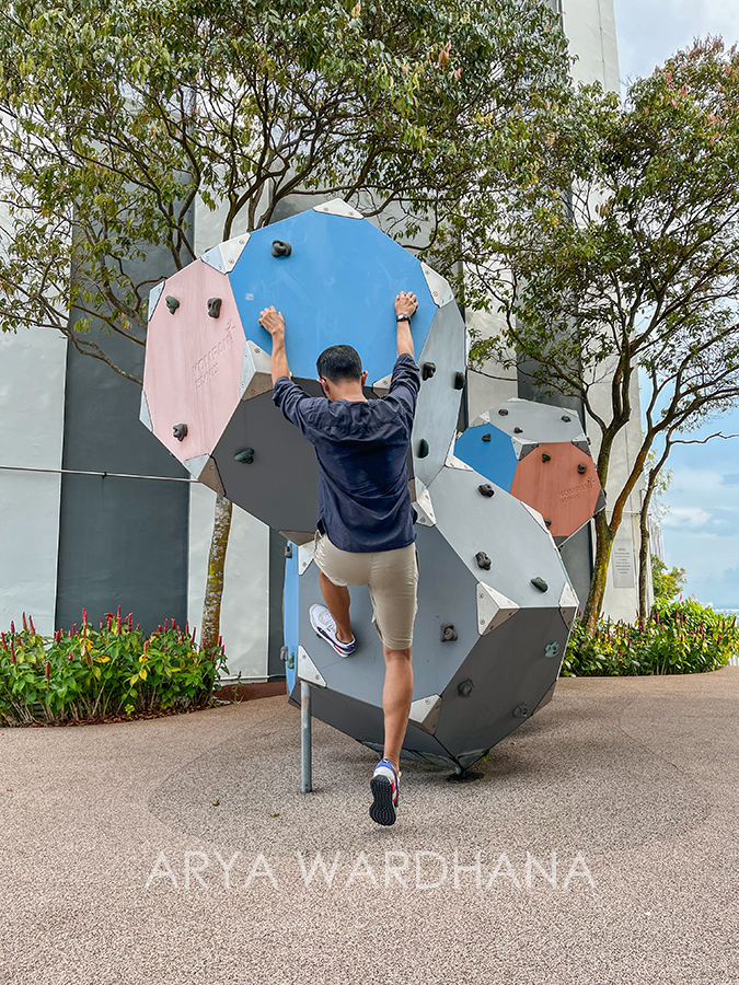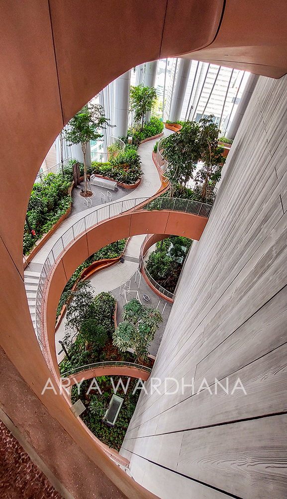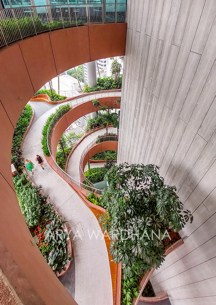Selain Sky Garden, di sini juga ada Green Oasis, berupa ruang hijau dengan konsep taman keliling yang menempati 4 lantai bangunan CapitaSpring. Kalian bisa mulai dari bawah ke atas, atau dari atas ke bawah. Kalau capek naik-turun, tenang saja ada lift yang beroperasi hanya di 4 lantai ini. Di sini itu banyak sekali tempat untuk bersantai, ada bean bag dan kursi rotan yang sengaja diletakan di beberapa sudut. Kalau butuh mengisi daya ponsel atau peralatan elektronik, di setiap kursi disiapkan colokan listrik. Bahkan kalau ingin work out, kalian juga bisa memanfaatkan peralatan gym outdoor. Meski pemandangannya tak sejelas di Sky Garden, tapi di sini kita merasakan pengalaman sensasi hutan beton Singapura. Di setiap sudut yang tampak hanya bangunan tinggi. Di sini juga ada satu resto di lantai 17, yaitu Sol Luna.