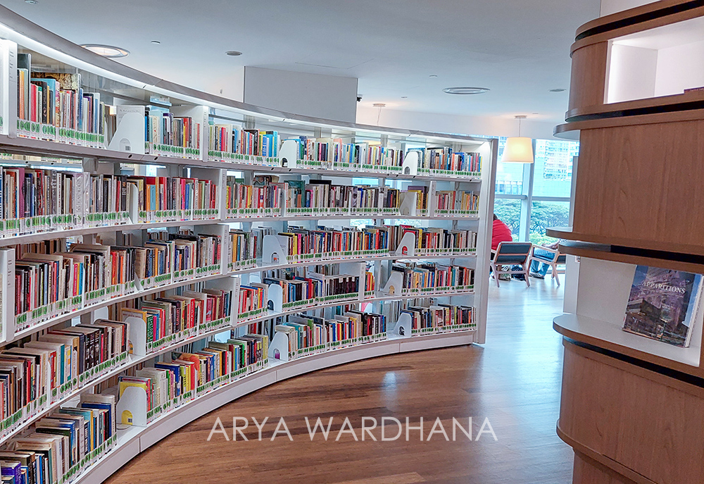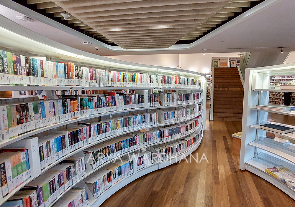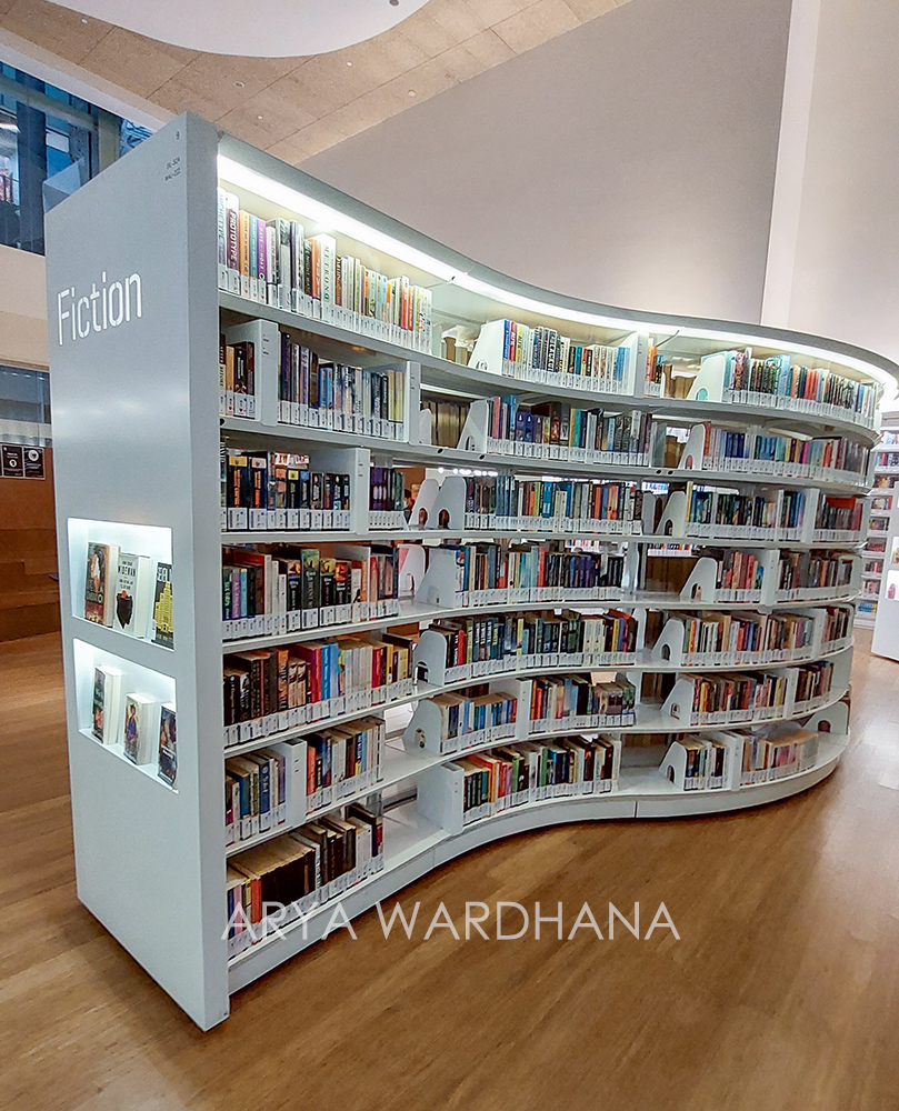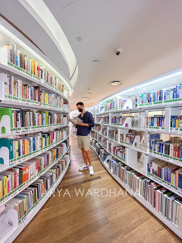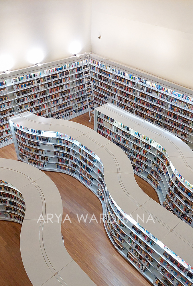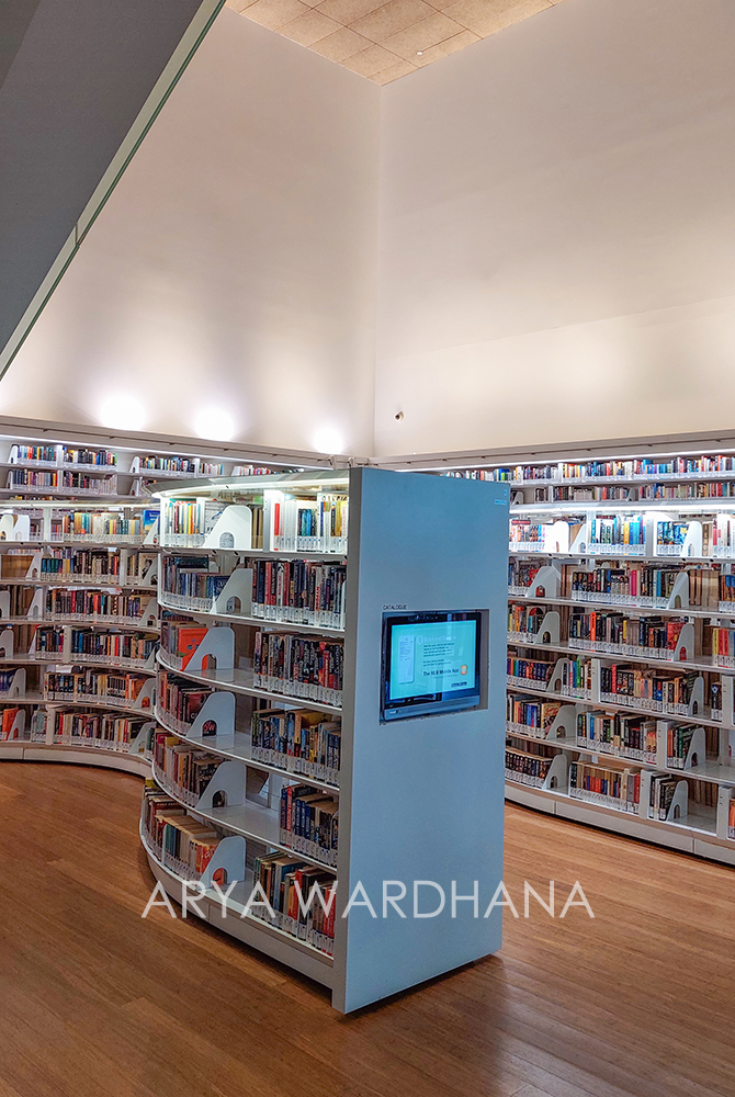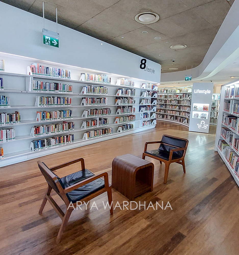 Perpustakaan baru ini agak lebih besar dari lokasi sebelumnya. Luasnya 1.700 meter persegi dan mencakup dua lantai mal, yang dinamakan The Studio dan The Loft. 45% dari 100.000 koleksi di sini berfokus pada desain, yang terbagi atas 5 kategori; people design, space design, product design, visual design, dan lifestyle design, sisanya adalah kategori dewasa muda. Oya, koleksinya ini mulai dari majalah, audio books, buku fiksi dan non-fiksi. Ciri khas perpustakaan ini adalah desain interior minimalis yang didominasi dengan warna putih dan bentuk rak buku yang unik seperti gelombang. Makanya di sini ada beberapa pengunjung yang sengaja datang untuk berfoto (meski beberapa ada juga yang datang untuk membaca buku tentunya). Perpustakaan cantik ini buka dari jam 11 pagi hingga 9 malam.