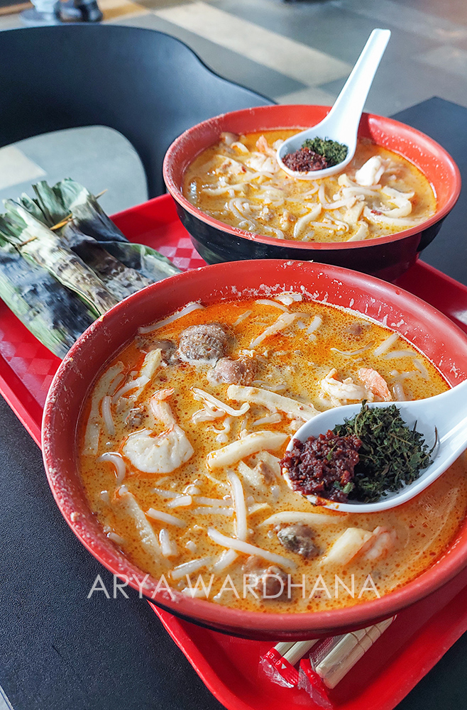 Kami kemudian memutuskan untuk makan siang di 328 Katong Laksa. Nah, kalau mau ke pusatnya di East Coast Road cukup jauh. Jadi kami memutuskan untuk ke cabangnya di United Square Shopping Mall yang berada di Thomson Road. Kami naik MRT North South Line dari stasiun MRT Somerset lalu turun di stasiun MRT Novena yang berada di mall Velocity @ Novena Square. Tinggal jalan kaki menyeberang ke United Square Shopping Mall. Lapaknya sendiri bukan di dalam mall ya, melainkan ada di bagian luar. Saat kami datang memang sedang ramai orang makan siang. Beruntung kami dibantu oleh uncle yang menjaga lapak laksa. Kami lalu memesan 2 porsi Medium Laksa. Pas memesan, si auntie sempat menunjukan sebuah cangkang kerang. Awalnya agak bingung juga, apalagi ngomongnya pakai Singlish. Baru kemudian ngeh maksudnya, pakai seafood atau tidak? Jadi kalian yang alergi seafood, bisa memesan tanpa udang dan kerang. Kami juga memesan Otah atau kalau di sini ya otak-otak namanya. Meski bentuknya sama (dengan dibungkus daun pisang) tapi isinya cukup beda, karena berwarna merah oranye kekuningan. Kayaknya dibuat dengan bumbu kunyit.