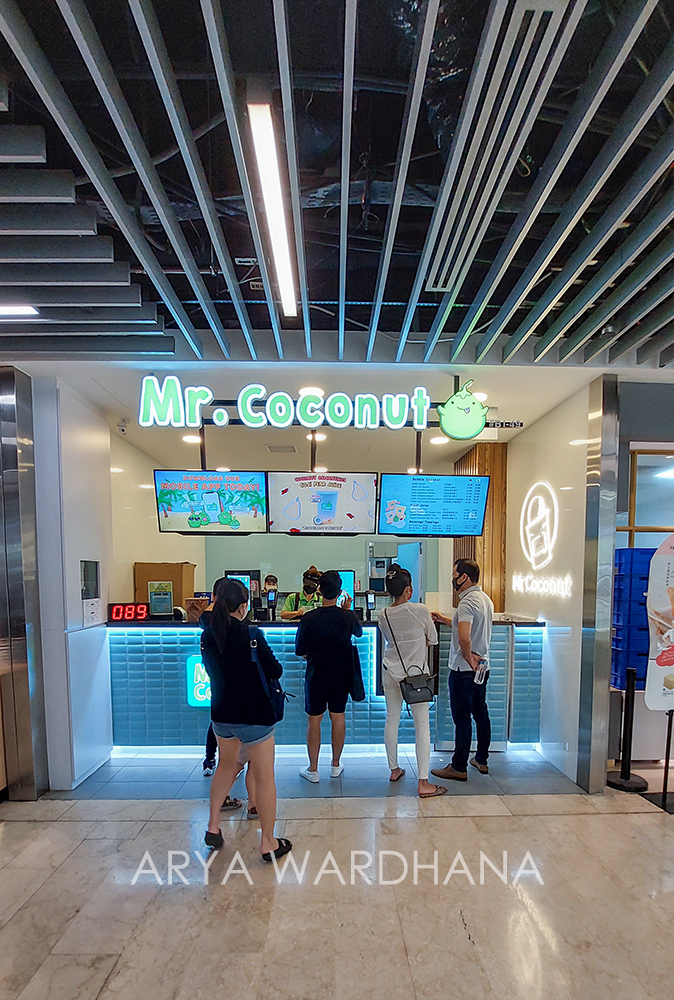 Sampailah kami di gerai Mr. Coconut. Gerai ini adalah salah satu cabangnya yang tersebar di Singapura, sejak pertama kali berdiri di 2016. Untuk menjaga keaslian rasa kelapa, Mr. Coconut hanya menggunakan kelapa muda dari Thailand. Kami kemudian memesan Coconut Shake karena penasaran dengan rasa yang original. Sebenarnya ada beberapa pilihan, seperti varian Coconut Oreo Shake, Coconut Strawberry Shake, Coconut Banana Shake hingga Coconut Cappuccino Shake. Cara memesannya pun mudah. Menggunakan layar sentuh dan cara pembayarannya bisa tunai maupun non-tunai. Pelayanannya terbilang cepat, kurang dari lima menit, pesanan kami pun sudah tersedia. Soal rasa, seger sih. Rasanya seperti minum air santan tapi ada sensasi rasa kelapa mudanya. Teksturnya cukup kental seperti float atau milkshake, tapi masih terbilang enak.
