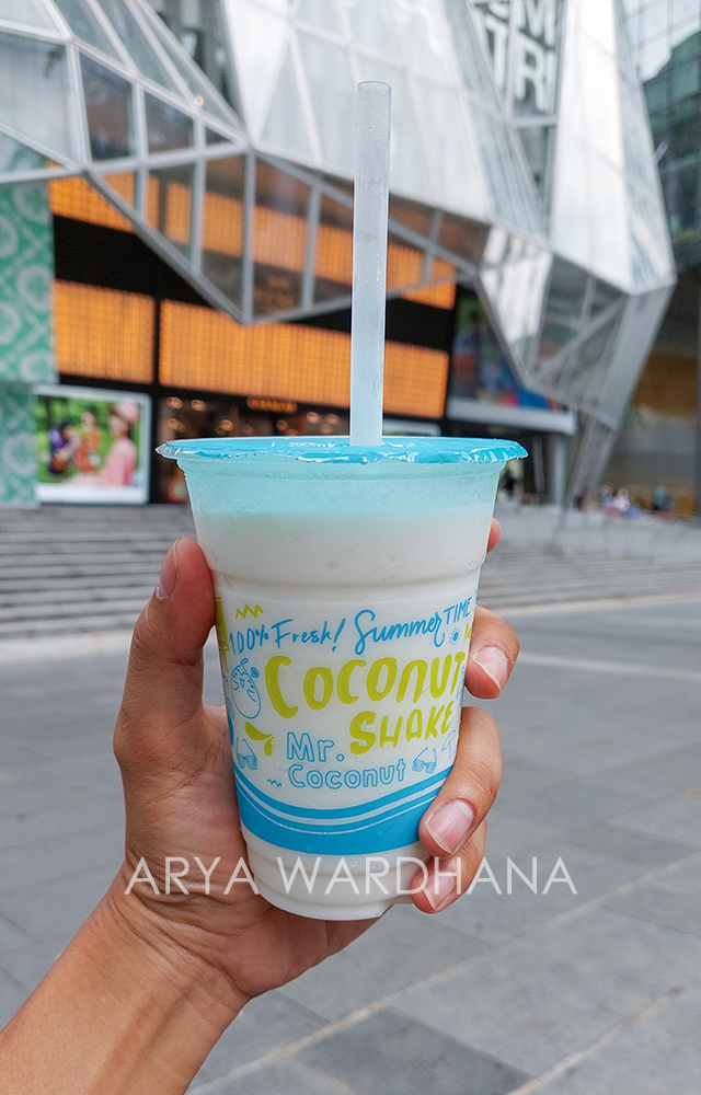 Puas makan laksa, kami kembali lagi ke Orchard dengan naik MRT. Sesampainya di Orchard, rencananya mau membeli ice cream sandwich di depan ION Orchard. Tapi kami mengurungkan niat karena perut sudah agak begah. Kami justru tertarik untuk membeli coconut shake dari air dan buah kelapa yang dijual Mr. Coconut. Kami lalu menuju ke Wisma Atria, tepatnya di lantai Basement 1. Intermezzo: Wisma Atria ini dibangun di bekas Wisma Indonesia yang dulunya adalah Kedutaan Besar Indonesia.