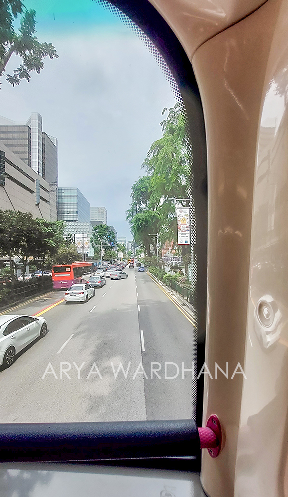 Tak lama, bus tingkat yang kami cari pun datang. Kami masuk tinggal tap kartu EZ Link dan langsung naik ke atas. Pas sekali, kursi paling depan masih kosong. Kami duduk di depan sambil menikmati jalanan Singapura yang kala itu cukup padat. Saat kami bersiap untuk turun, kami sempat bingung akan turun di mana. Rencananya kami mau menuju Pinnacle@Duxton, dan untuk menuju ke sini kami harus turun di halte Outram Pk Stn Exit. Tapi kami kebablasan hingga ke halte Bef Kampong Bahru Ter (dua halte lebih depan).