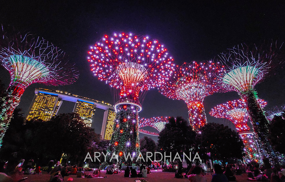 Untuk Garden Rhapsody, setiap malamnya ada dua kali pertunjukan, yaitu jam 7.45 dan 8.45 malam. Saran saya, bawa alas jika mau duduk nyaman di atas rerumputan. Malam itu kami menyaksikan pertunjukan yang pertama dan serunya, malam itu mereka mainkan lagu-lagu nasional Singapura karena bertepatan dengan hari kemerdekaan Singapura yang jatuh pada 9 Agustus yang lalu. Selesai menyaksikan Garden Rhapsody, kami berniat untuk menonton Spectra di depan Marina Bay Sands. Tapi berhubung waktunya sangat berdekatan dan kami sudah lapar, akhirnya kami lanjut mencari makan malam di Lau Pa Sat.