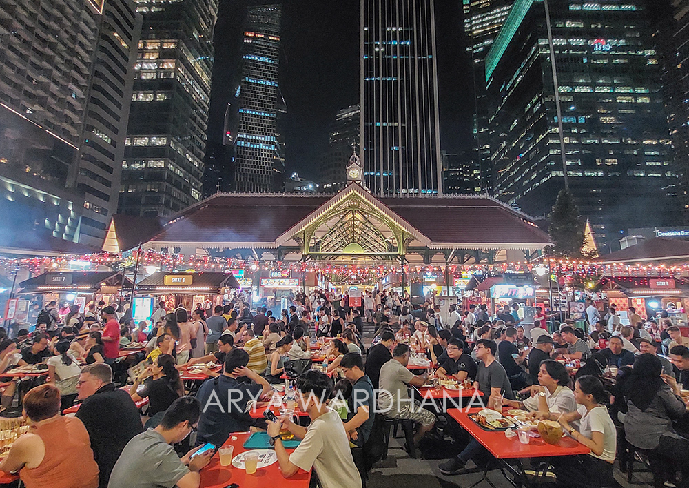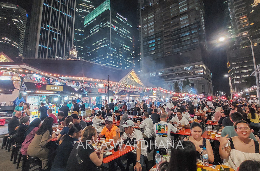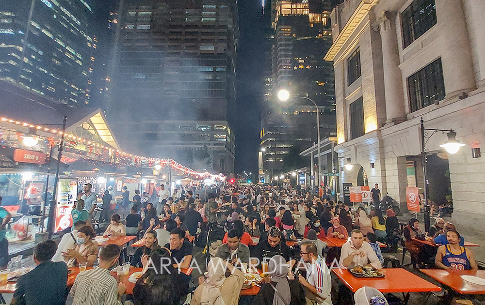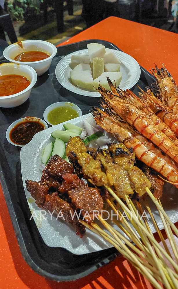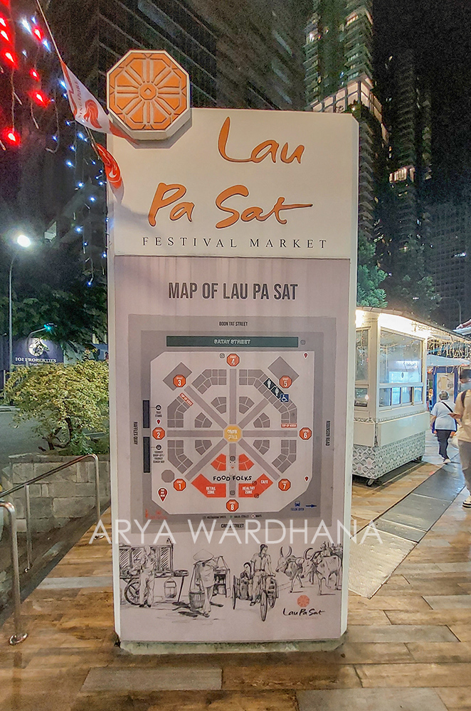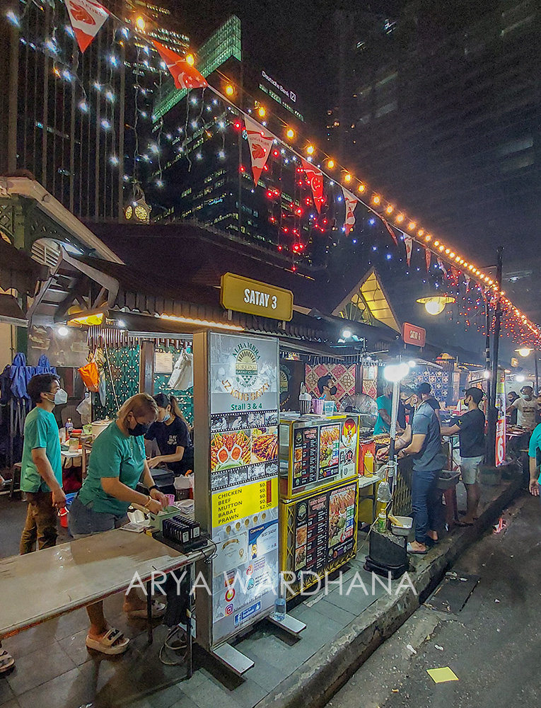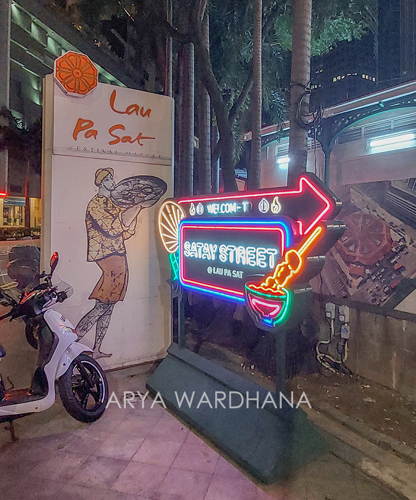 Nama Lau Pa Sat sendiri makin dikenal setelah disebut dalam novel Crazy Rich Asians. Saat itu Nick Young mengajak tunangannya, Rachel Chu untuk makan di sini bersama dua teman Nick yang hendak menikah, Colin Khoo and Araminta Li. Mereka diceritakan makan malam di sini. Di dunia nyata, hingar-bingar Lau Pa Sat tak jauh berbeda. Pusat kuliner ini buka 24 jam dan ramai pada saat makan siang dan makan malam. Ada lebih dari 200 kedai makanan dan minuman, mulai dari kuliner lokal, Melayu, Vietnam, India, makanan vegetarian, hingga makan halal dan non-halal. Nah, kalau malam di jalan sebelah belakang Lau Pa Sat atau Boon Tat Street ditutup dan berubah menjadi Satay Street. Ada banyak penjual sate di sini, dari ujung ke ujung. Jalan yang ditutup tadi pun disulap jadi tempat makan. Teman saya memilih kedai Satay nomor 3, yaitu Alhambra AZ King Satay. Katanya ini yang paling enak. Pelayannya pun langsung sigap mencarikan tempat makan. Bayangkan saja, malam itu kondisinya ramai sekali dan kami bisa cepat mendapatkan meja berkat mereka.