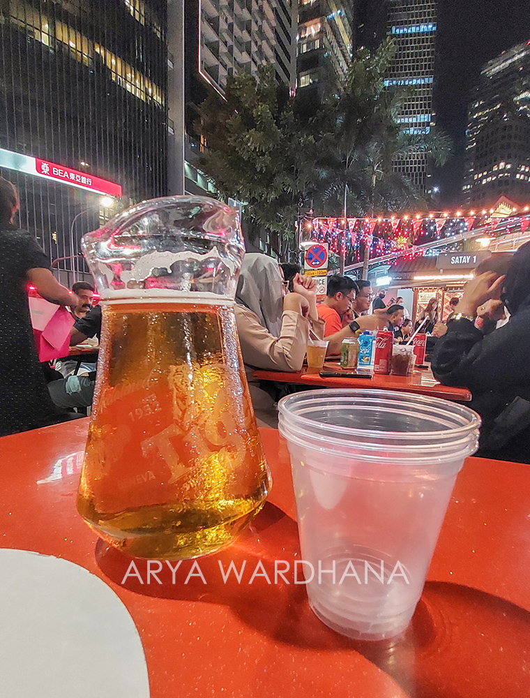 Kami lalu memesan paket sate seharga SGD38 untuk dua orang. Isinya 10 tusuk sate ayam, 10 tusuk sate udang, 5 tusuk sate sapi, 5 tusuk sate domba, dan 2 lontong. Setelah membayar, kami diberikan alat yang akan berbunyi jika pesanan sudah siap diambil. Sambil menunggu makanannya jadi, saya mencoba berjalan ke dalam untuk mencari bir. Tiba-tiba ada auntie yang menawarkan 1 pint Tiger Beer dengan harga SGD22. Berhubung malas antre, saya langsung bayar dan bawa bir itu ke meja kami. Bir dingin jadi berasa segar karena malam itu cuaca di Singapura agak sumuk. Tak lama alatnya berbunyi dan saya langsung ambil pesanan kami.