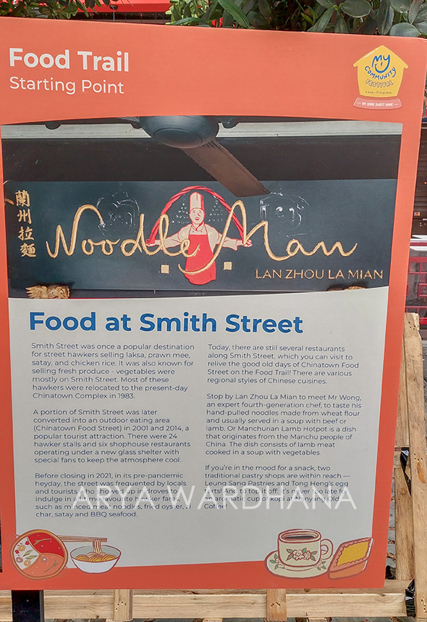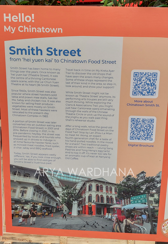 Hari ini jadi hari terakhir kami di Singapura. Semalam, sepulang dari Lau Pa Sat kami langsung mengemasi barang-barang kami supaya hari ini bisa early check-out. Sebelum check-out, kami mau mencari sarapan dulu di kawasan Chinatown. Kebetulan hari ini adalah hari sabtu dan di kawasan Smith Street ada acara yang diselenggarakan oleh My Community, sebuah organisasi nirlaba yang berfokus pada pelestarian budaya dan warisan komunitas-komunitas di Singapura. Mereka ini membuat acara semacam walking tour self-guided trails dengan tiga rute di sekitar Chinatown. Sayangnya kami baru tahu di hari itu dan sepertinya waktu kami tidak akan cukup.