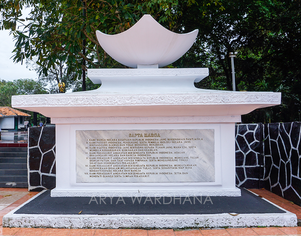 Di dalam kawasan Monumen Pancasila Sakti, kita akan menemukan dua prasasti. Pertama bertuliskan naskah Pancasila, dan yang kedua merupakan Sapta Marga, pedoman prajurit Angkatan Bersenjata Republik Indonesia (ABRI), kini Tentara Nasional Indonesia (TNI) yang dikeluarkan pada 5 Oktober 1951. Sapta Marga bertujuan mencegah terjadinya perpecahan dari internal atau dari dalam tubuh TNI. Keduanya seakan menjadi pengingat tentang ideologi negara dan juga keberpihakan TNI.