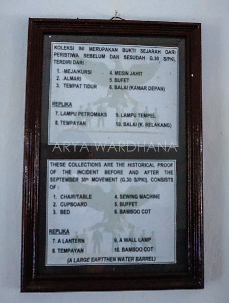 Koleksi museum ini adalah diorama yang menceritakan pemberontakan G30S, mulai dari rapat persiapan pemberontakan, latihan para sukarelawan di Lubang Buaya, peristiwa G30S, hingga kejadian penculikan masing-masing Pahlawan Revolusi. Jumlah diorama di dalam museum ini sebanyak 16 diorama dan tersebar di lantai 1 dan 2. Selain diorama, museum ini juga terdapat Ruang Relik yang berisi barang-barang peninggalan para Pahlawan Revolusi, terutama pakaian yang mereka kenakan ketika mereka diculik, disiksa, sampai akhirnya dibunuh. Selain itu juga terdapat hasil visum dari dokter dan Aqualung, sebuah alat bantu pernapasan yang digunakan untuk mengangkat jenazah 7 Pahlawan Revolusi dari dalam sumur tua.