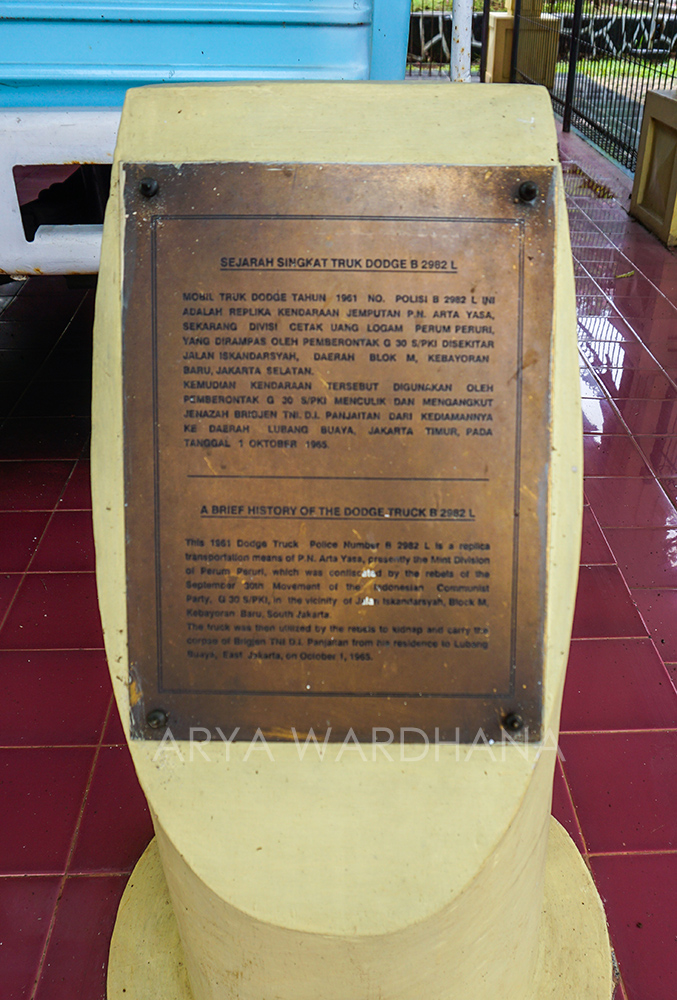 Masih di dalam kawasan monumen, terdapat sebuah mobil truk Dodge yang digunakan untuk membawa jenazah Brigjen D.I. Pandjaitan, dari rumahnya di Jalan Sultan Hasanudin No. 52, Kebayoran Baru menuju ke daerah Lubang Buaya. Truk Dodge 1961 buatan Amerika Serikat dengan nomor polisi B 2982 L ini merupakan replika kendaraan jemputan P.N. Arta Yasa, yang lokasinya berada di Perum Peruri yang sekarang. Kendaraan ini dirampas di sekitar Jalan Iskandasyah Raya saat meninggalkan pool kendaraan Perum Peruri pada jam 4 pagi. Supir bernama Oman ditodong dengan senjata yang ditembakkan ke atas, sehingga akhirnya menyerahkan truk yang dikendarainya.