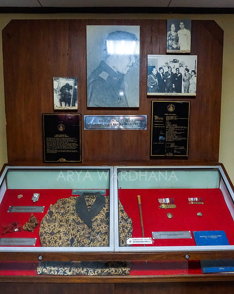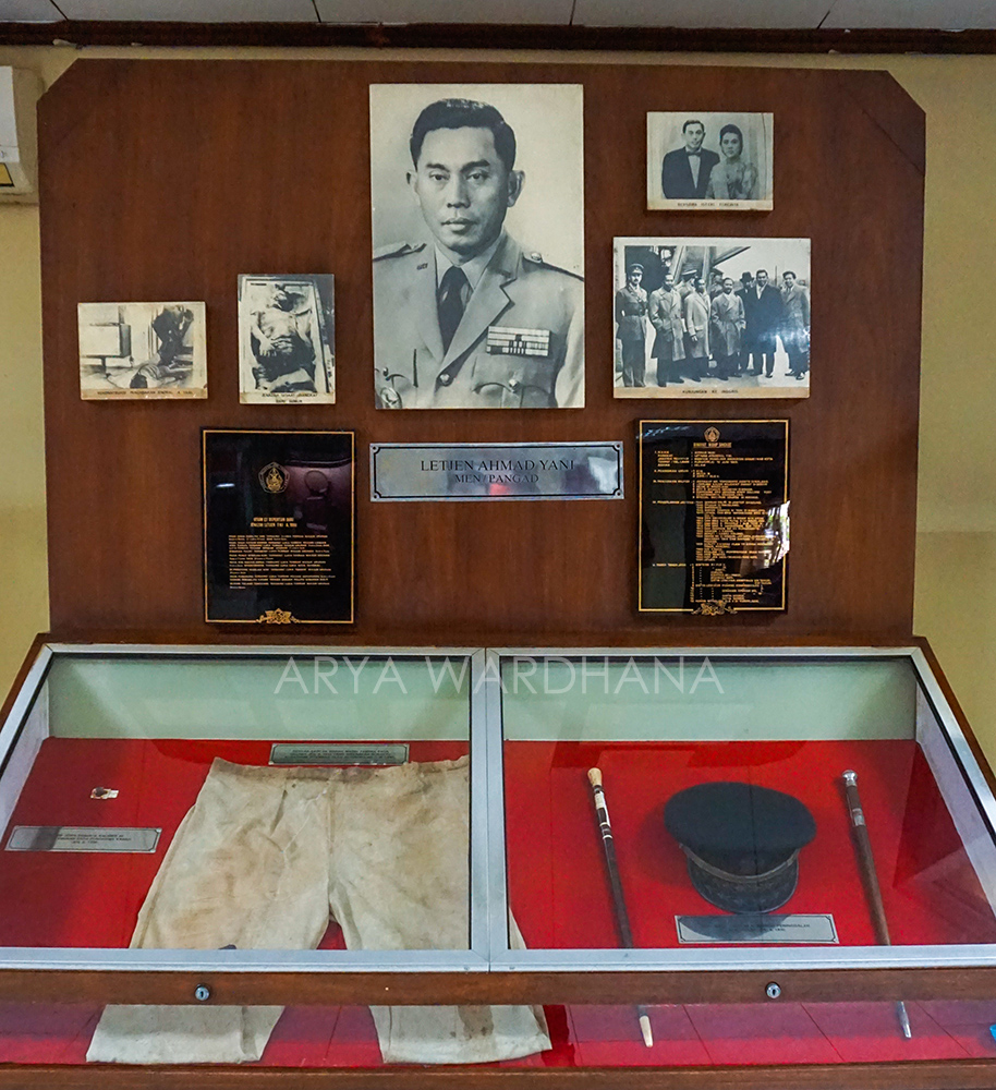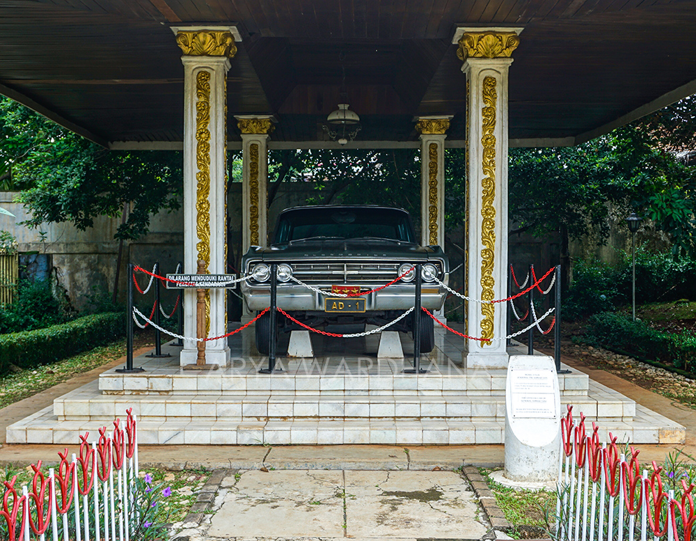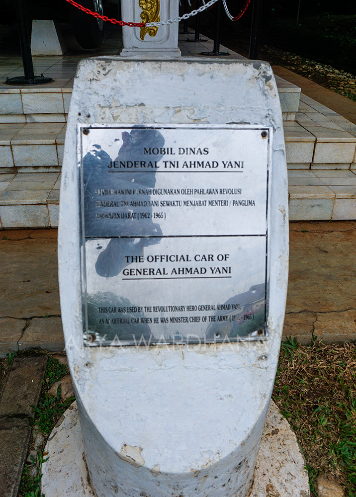 Di bagian luar, kita akan menemukan dua kendaraan. Pertama adalah Mobil Dinas Letnan Jenderal Ahmad Yani. Mobil dengan nomor registrasi AD-01 ini merupakan kendaraan yang digunakan oleh Letjen Ahmad Yani. Mobil berwarna hijau army ini kemudian menjadi milik keluarga Ahmad Yani pada 6 Juni 1966. Baru kemudian dipamerkan pada Mei 1989 atas inisiatif Kepala Pusat Sejarah dan Tradisi ABRI atau sekarang Pusat Sejarah TNI. Kemudian kendaraan yang kedua adalah Mobil Dinas Mayjen Soeharto. Jeep Toyota Kanvas dengan nomor 04-62957/44-01 ini digunakan Soeharto untuk menumpas G 30 S. Ia menggunakan mobil ini dari rumahnya di Jalan Agus Salim menuju ke Markas KOSTRAD dengan dikemudikan oleh Prajurit Satu (Pratu) Soewondo. Mobil ini juga digunakan untuk mengantarkan Soeharto menuju ke Desa Lubang Buaya pada 4 Oktober 1965 untuk memimpin langsung jalannya pengangkatan jenazah oleh pasukan KIPAM (Kesatuan Intai Para Amphibi) KKO Angkatan Laut.